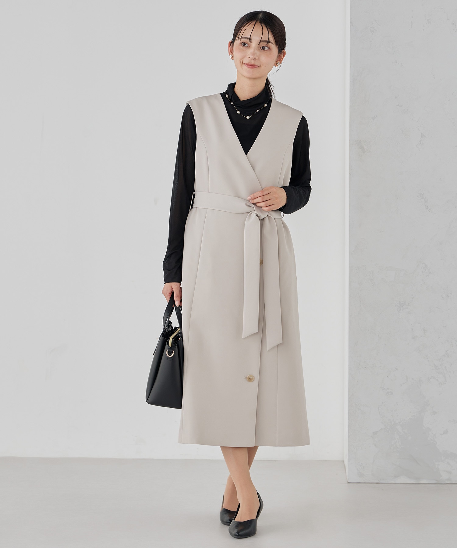 【洗える/ストレッチ/セットアップ対応】ダブルクロスロングジレワンピース