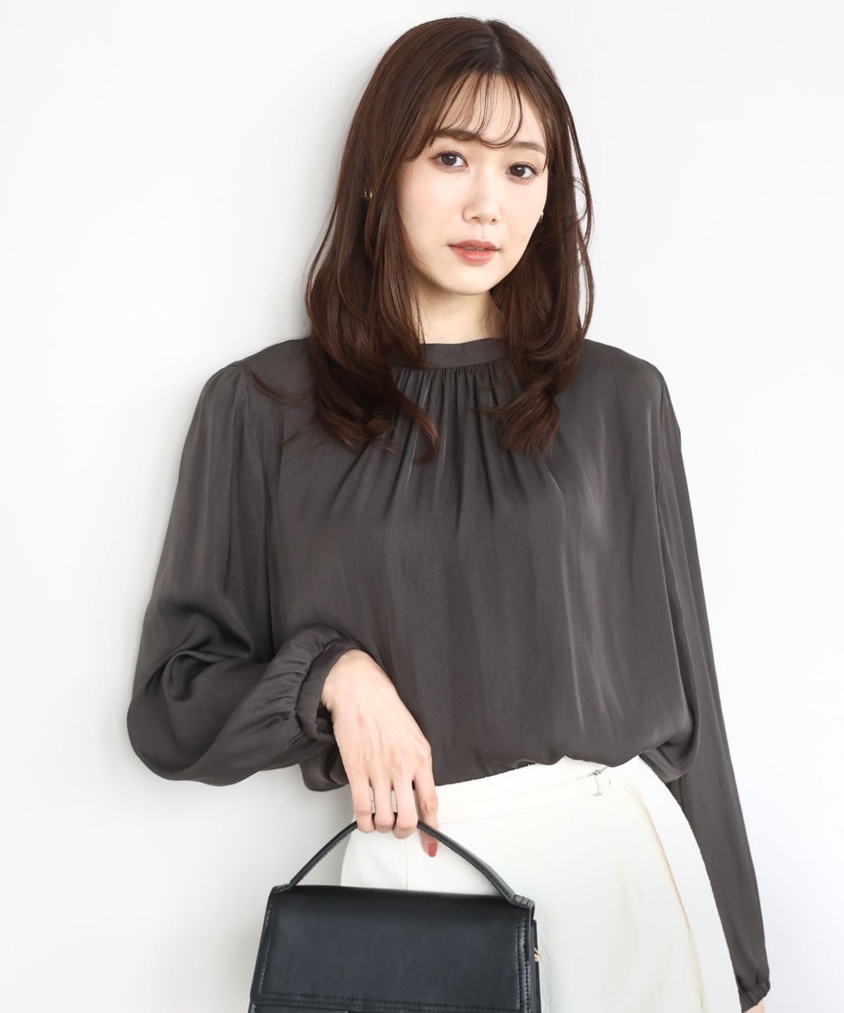 『起毛サテンバンドカラーギャザーブラウス&起毛サテンガウチョパンツ』