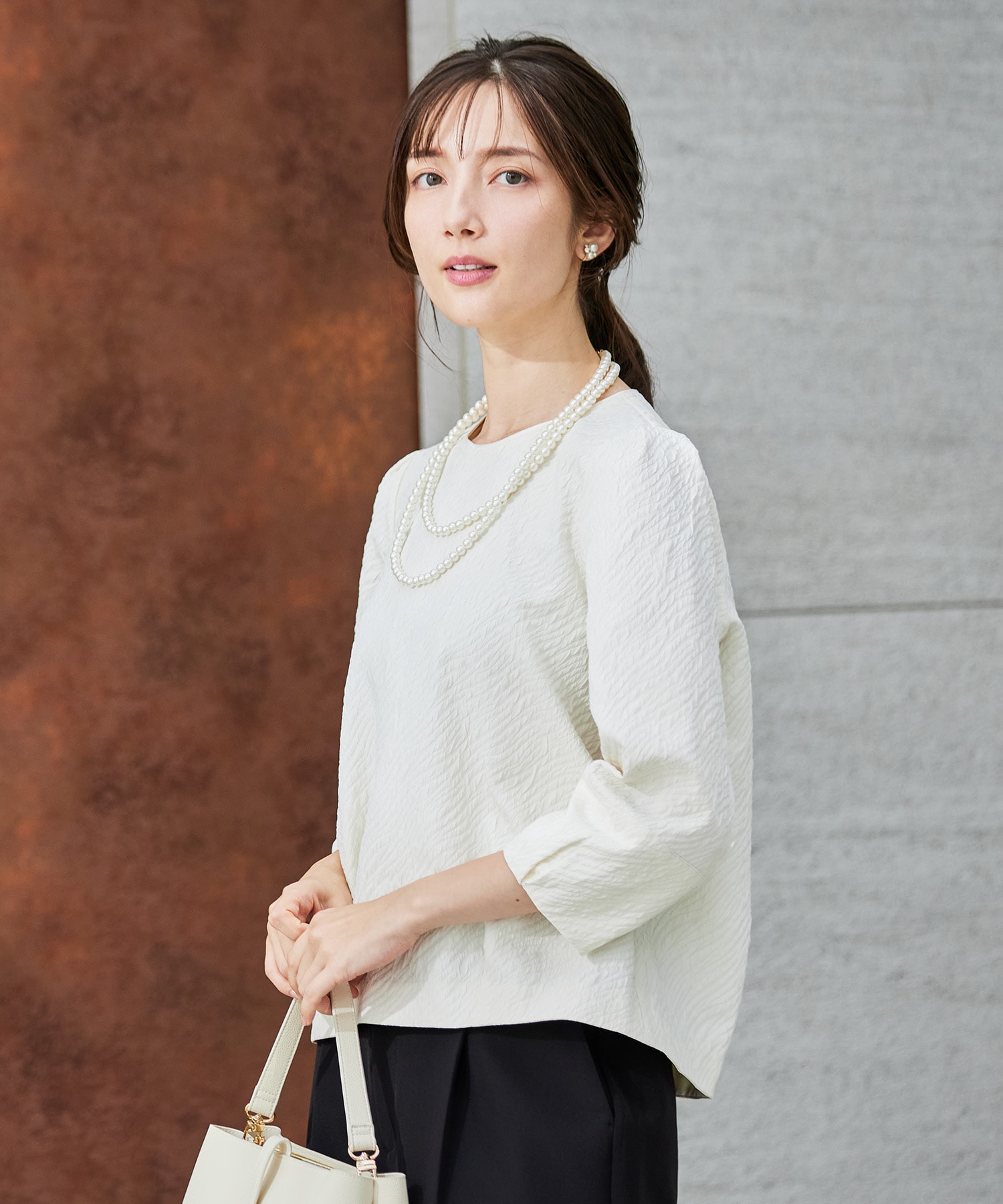 こんにちは!今回は一枚はもちろん、お仕事シーンでのジャケットやカーディガンのインナーにおすすめインもアウトも決まる丈感でボトムを選ばないジャガードコクーンブラウスご紹介致します