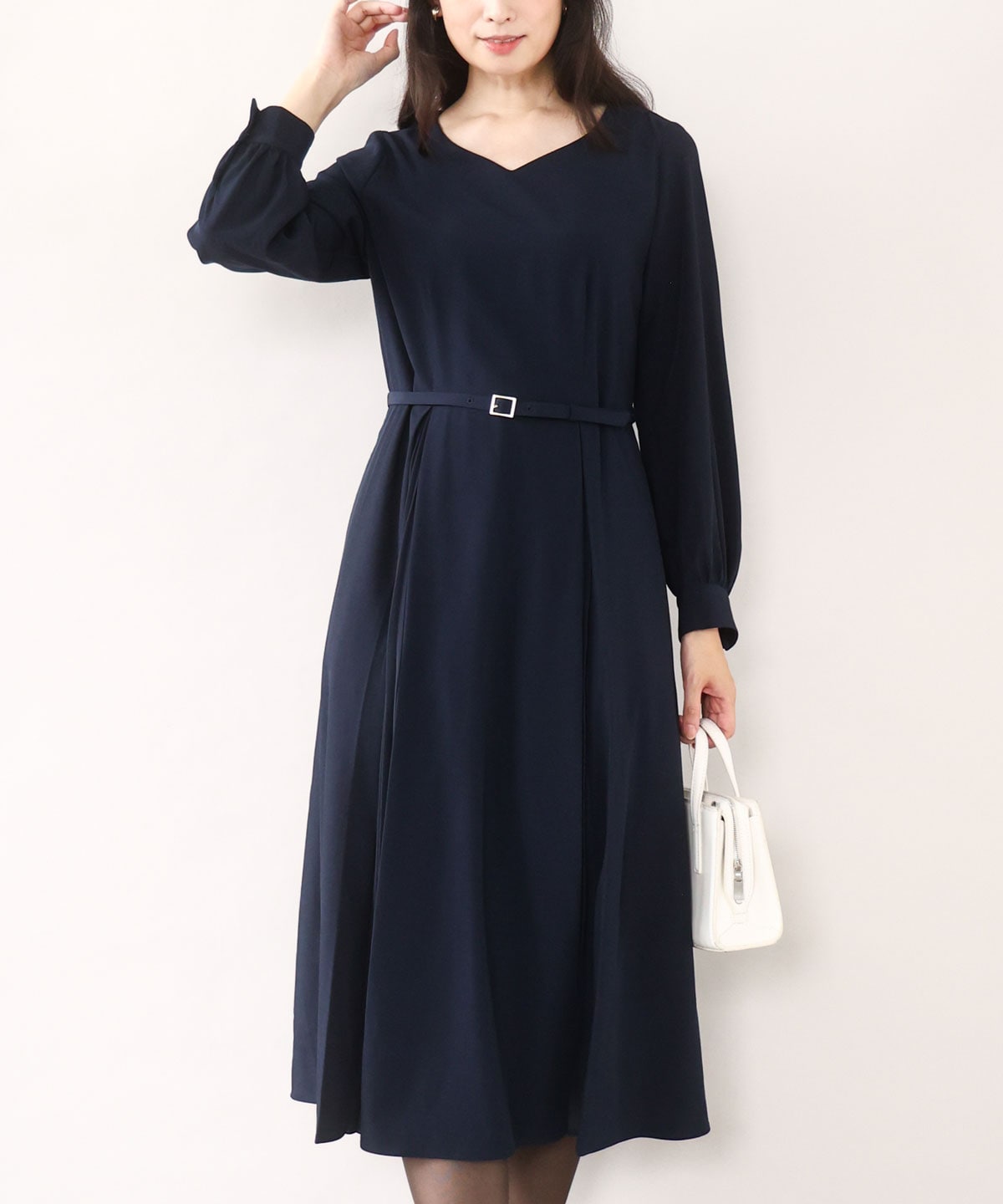 スッキリとしたネックラインとチラッと見えるシフォンのプリーツが華やかで上品なワンピースです