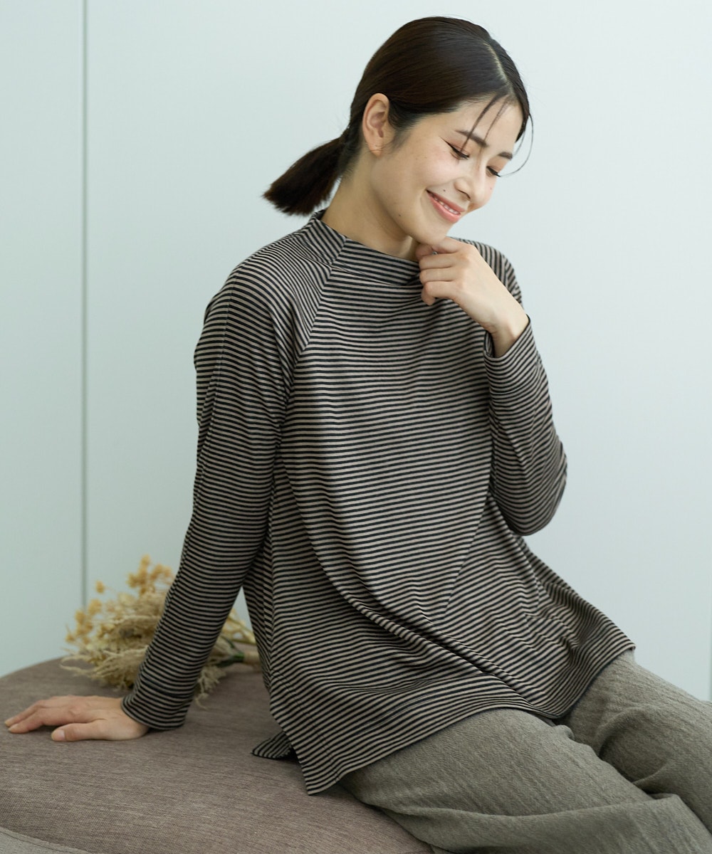 ロゴカットソーとインナーに合わせたボーダーカットソーは、ソフトな肌触りと上品なデザインが魅力。大人のカジュアルスタイルにぴったりで、着回しやすさも抜群です。