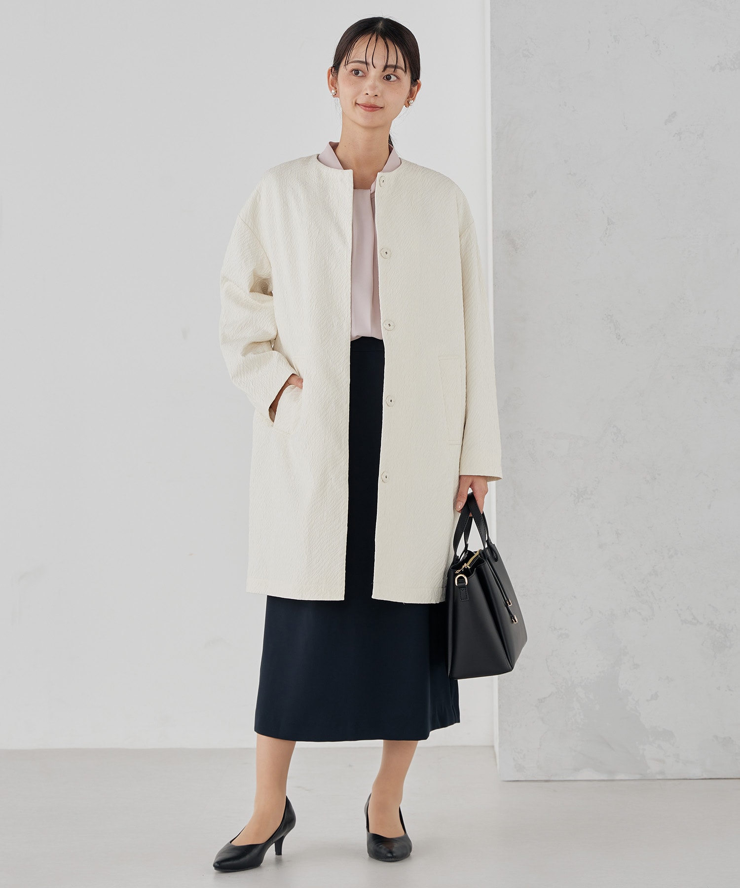 細かいフクレジャガードで高見え間違いなしの、オンオフ着られるノーカラーコートです!
