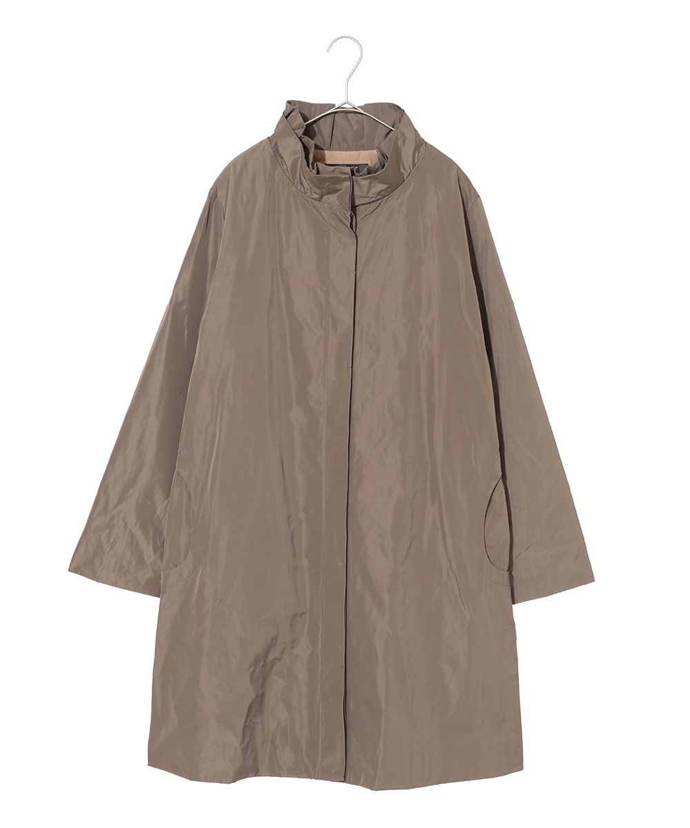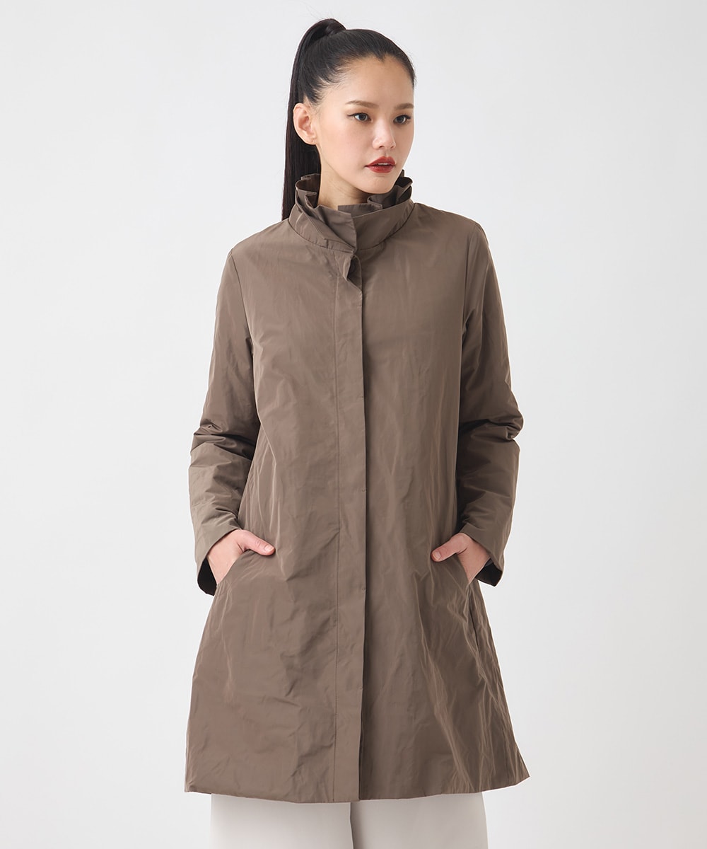 メモリータフタフリルカラーコートは、軽やかなダウン素材ながらスタイリッシュなAラインシルエットで、着膨れしないスマートな印象を演出。