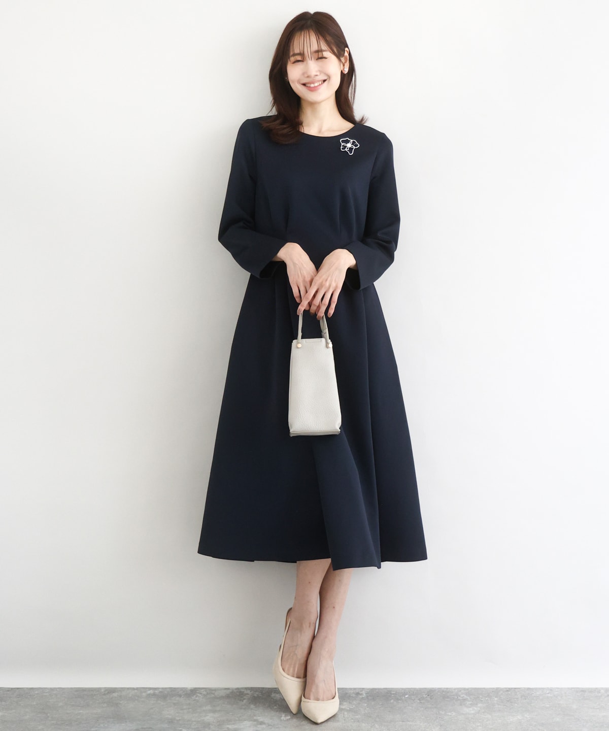 胸下のタックデザインが女性らしい立体感とフレアシルエットを演出し、大人のきれいめコーデにぴったり。