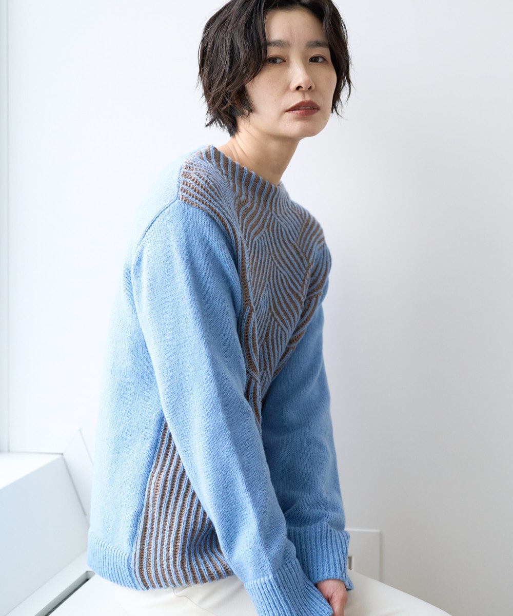 あえて寒色のカラーニットを着ることで、アウターの重たい印象を軽やかに見せられるようにしてみました!