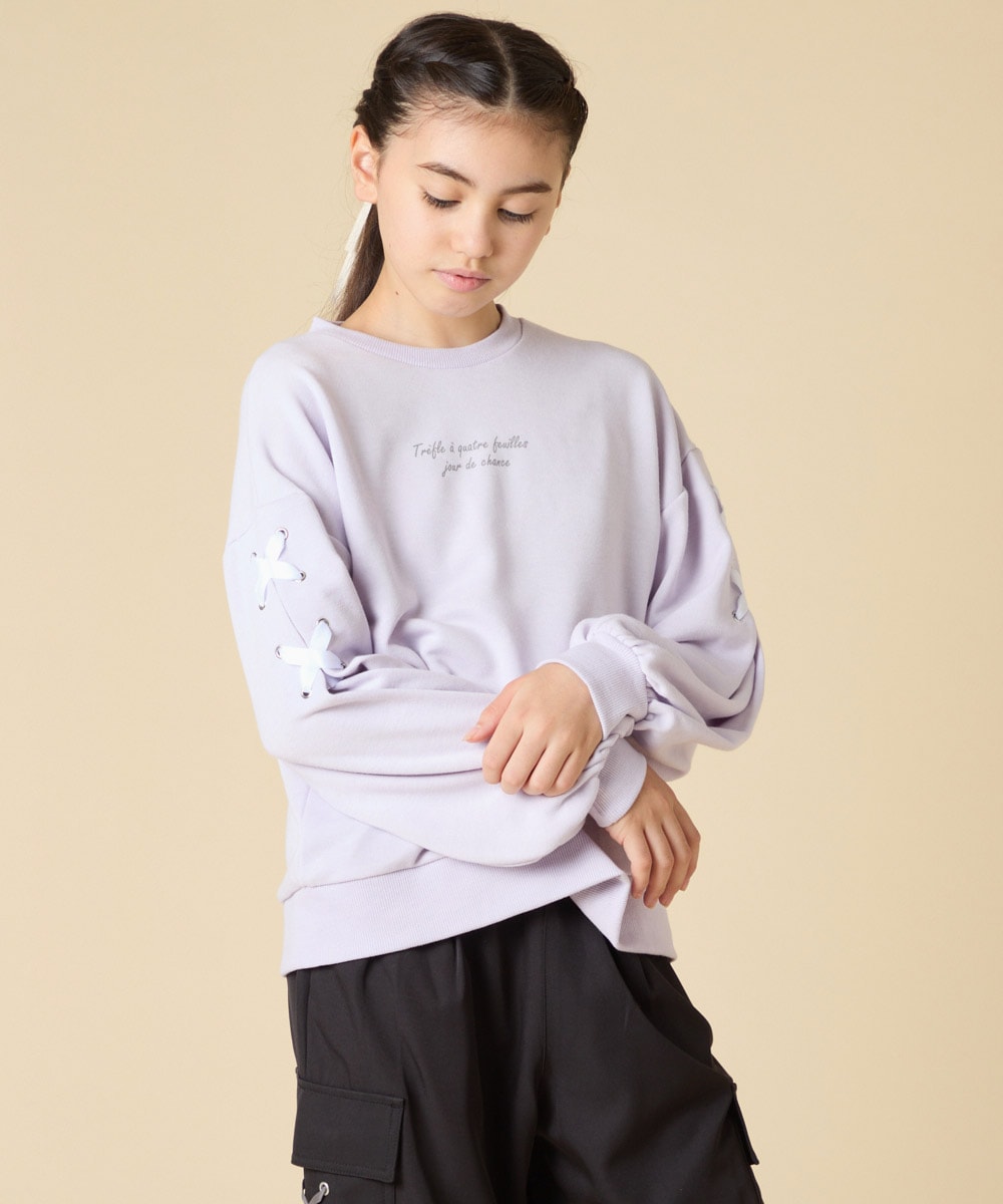 [120-160]【人気NO.1トップス!/袖レースアップ/プチロゴ/通学にもオススメ】レースアップスリーブトレーナー