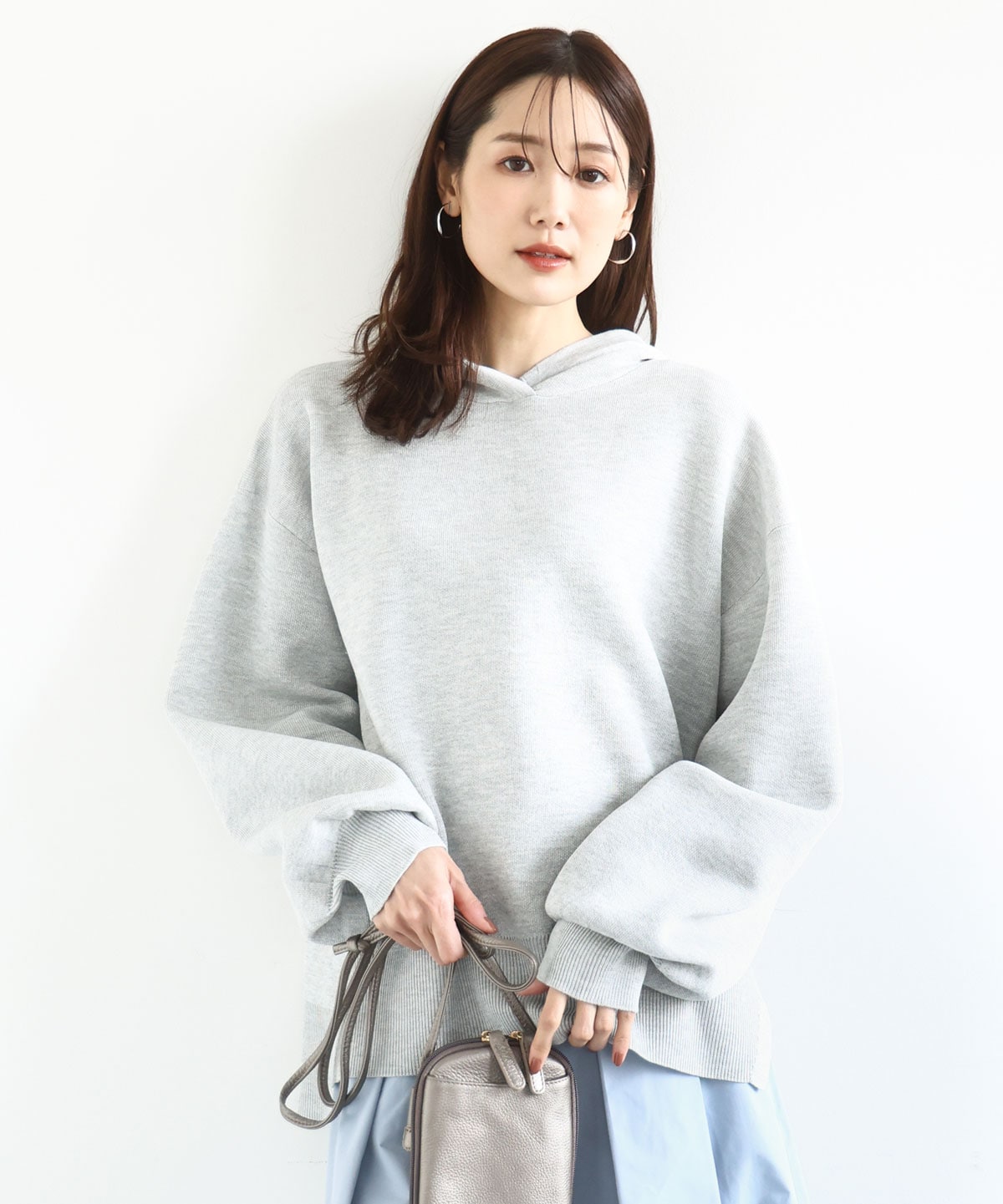 スウェット素材よりも大人っぽくきれいめに着こなせるニットフーディです。