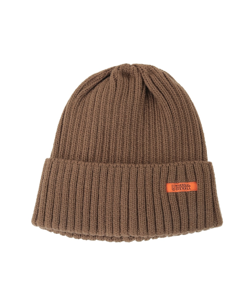 シンプルなリブニットキャップは、 UNIVERSAL OVERALLのロゴタグと細めのリブ編みがポイント。