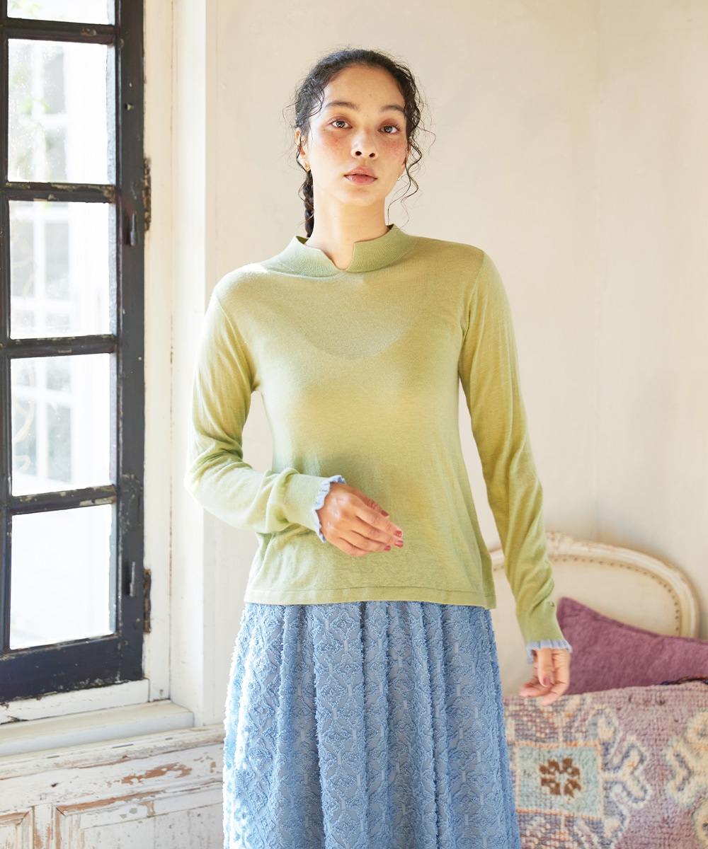 インナーは、ふんわりと柔らかさのあるニット素材。本体部分は毛と水溶性ビニロンという合成繊維で編みたてた後、水溶性ビニロンを溶解し空洞を作る工程を加え、軽く柔らかな風合いを実現しました。毛100%で暖かさもありながら、明るくソフトな春カラーで寒い時期から春を取り入れられます。