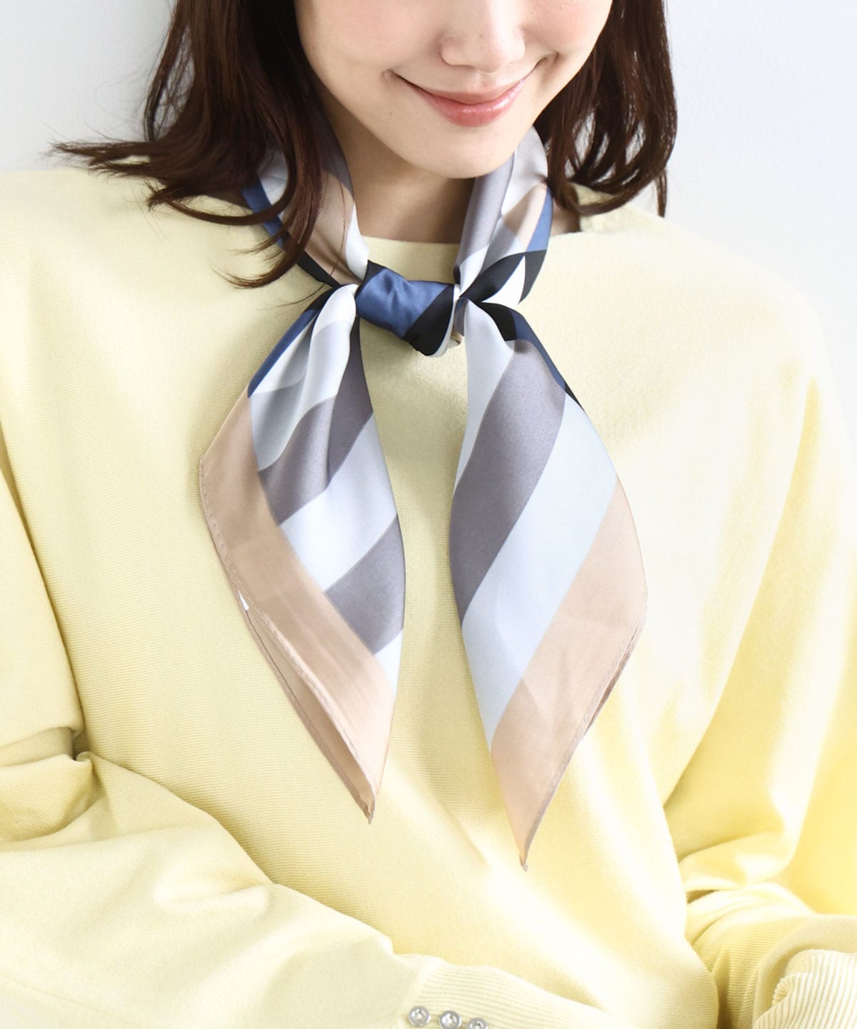 幾何柄スカーフをプラスすれば、一気に華やかさと個性を演出できます。