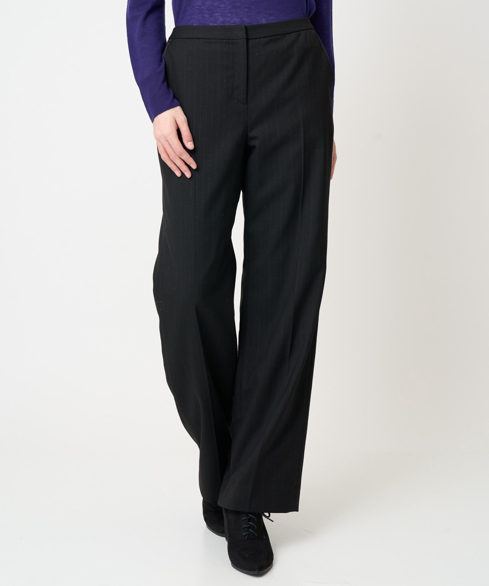 ジャケット見えするジャージ素材の羽織アイテムを、ラメ糸のピンストライプパンツとファーティペットを合わせて、簡単お出掛けコーディネートの完成です!