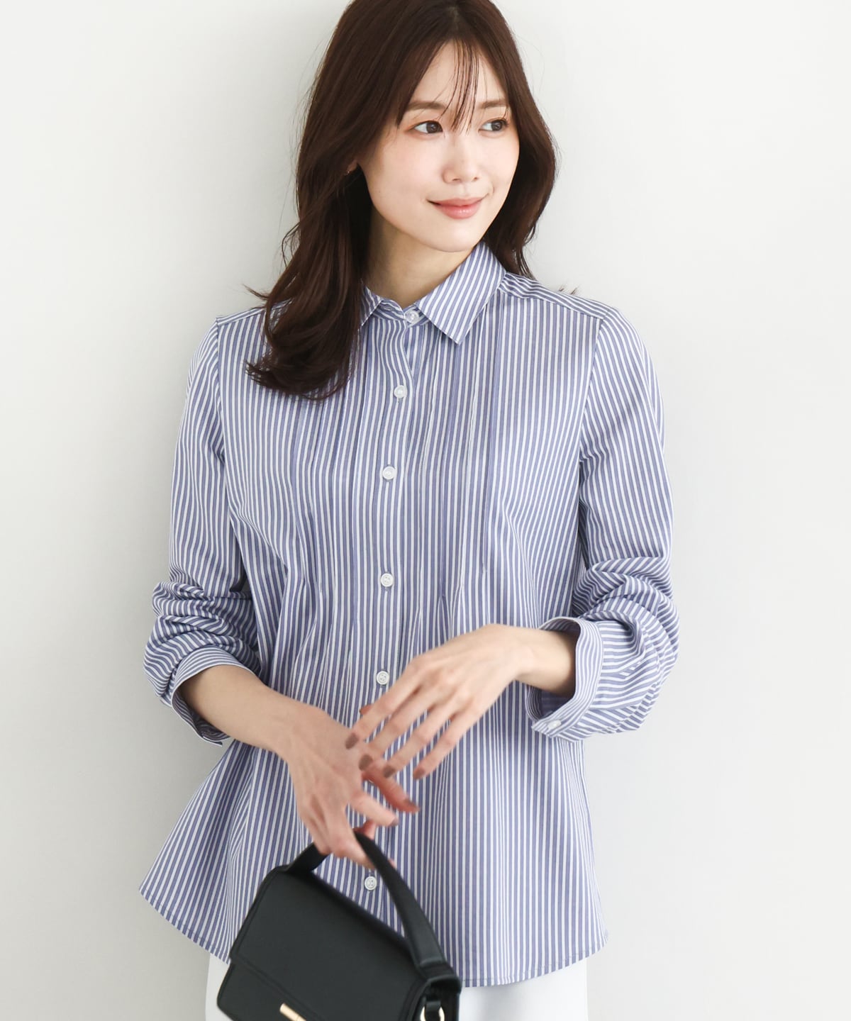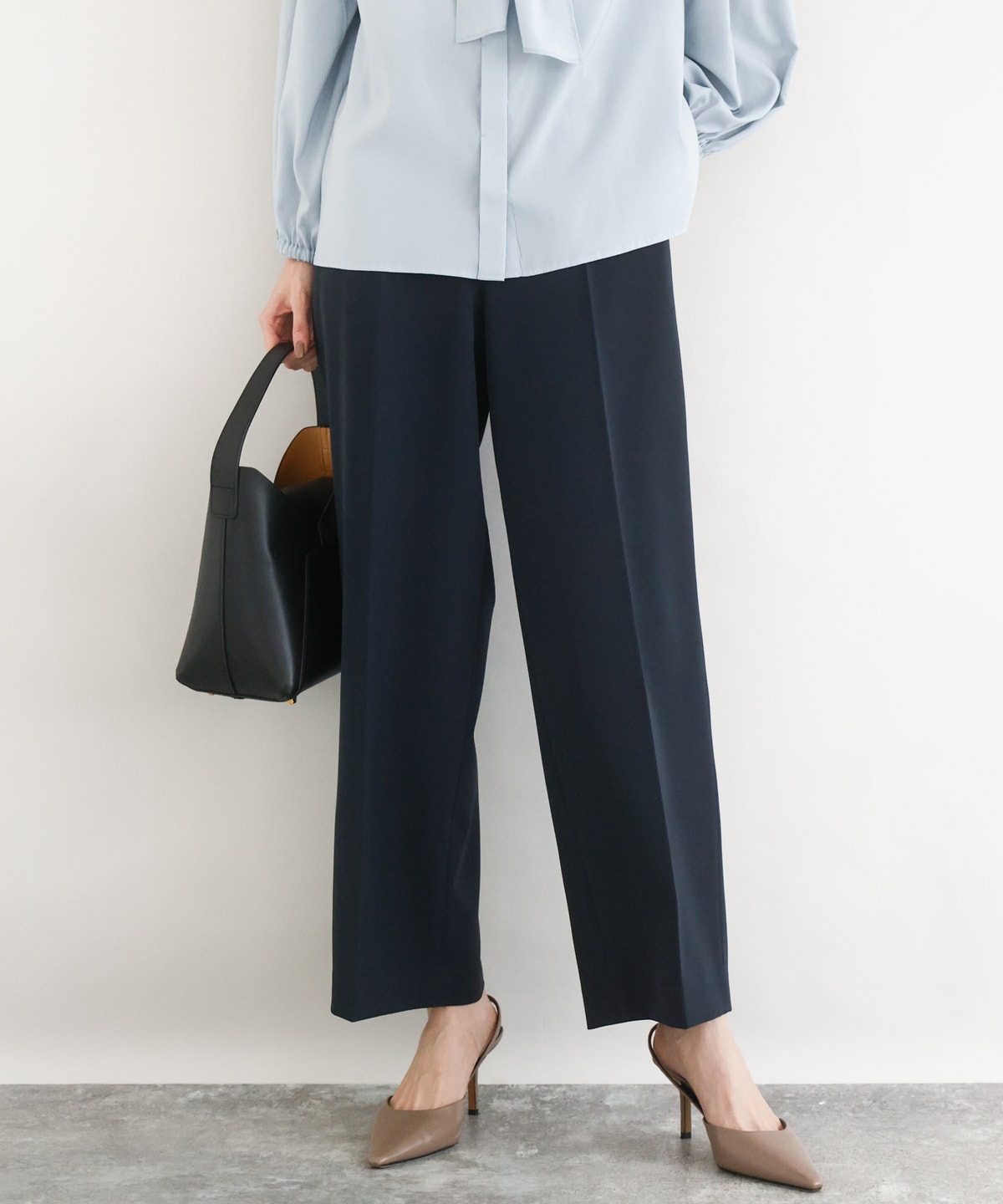 毎日のお仕事に便利な、シンプルきれいめスタイリング。ロングシーズンで着用可能なベーシックアイテムの組み合わせです。