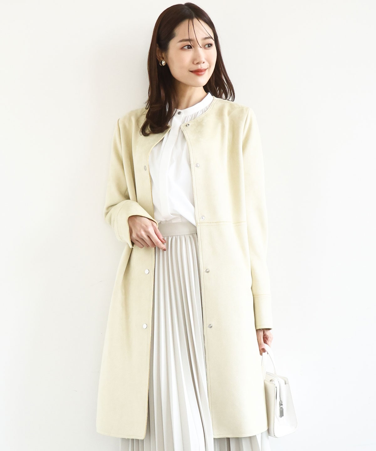 キレイなライトイエローのコートは伸縮性豊かなストレッチコート