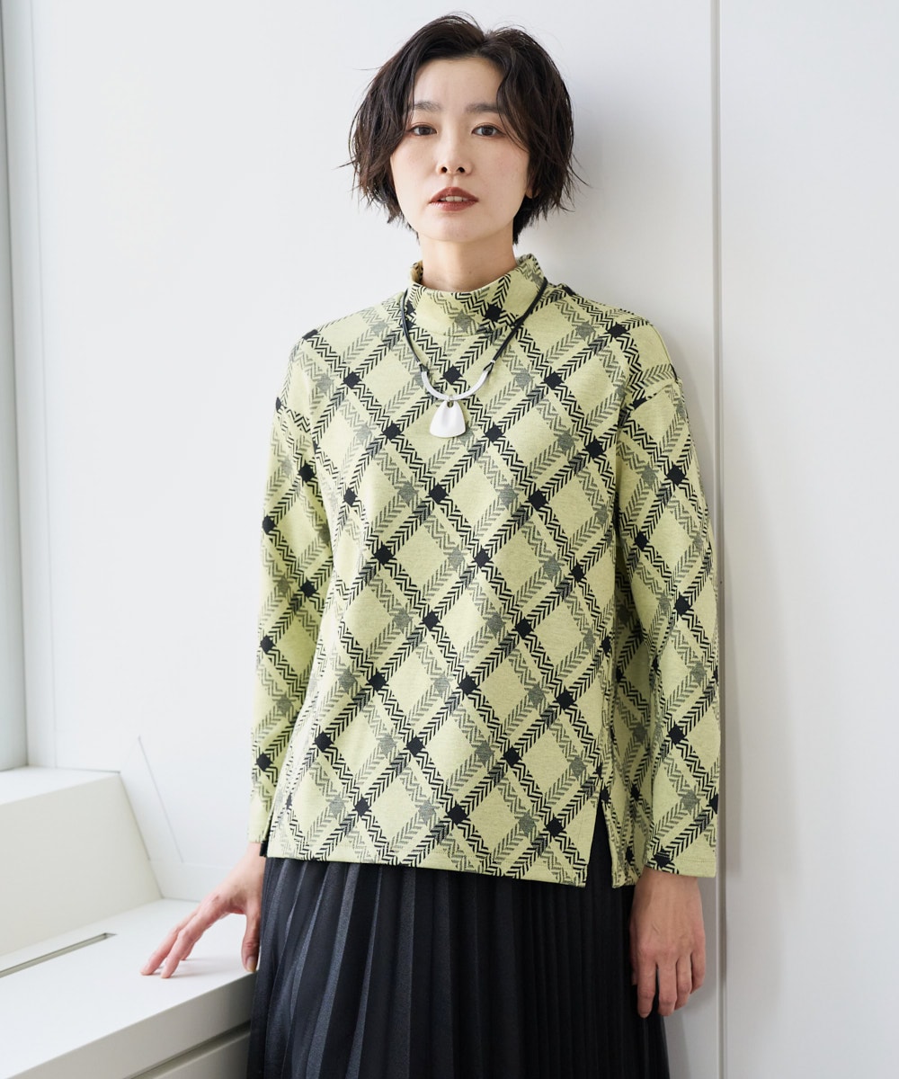 顔映りが明るくなるようにインナーには柄とカラーが効いたカットソーを合わせました。
