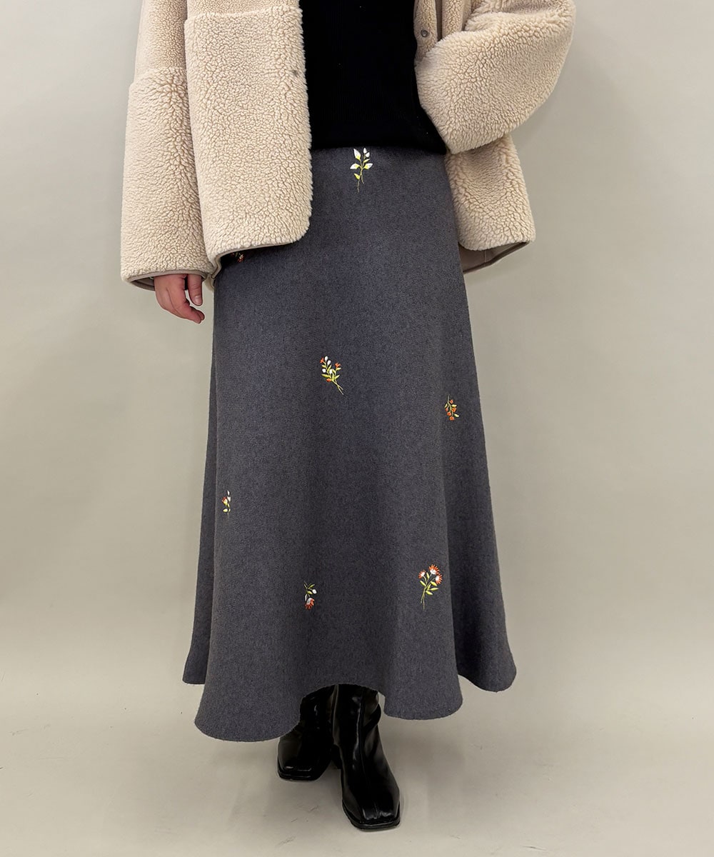 【セットアップ対応・洗える】フラワー刺繍フレアニットスカート