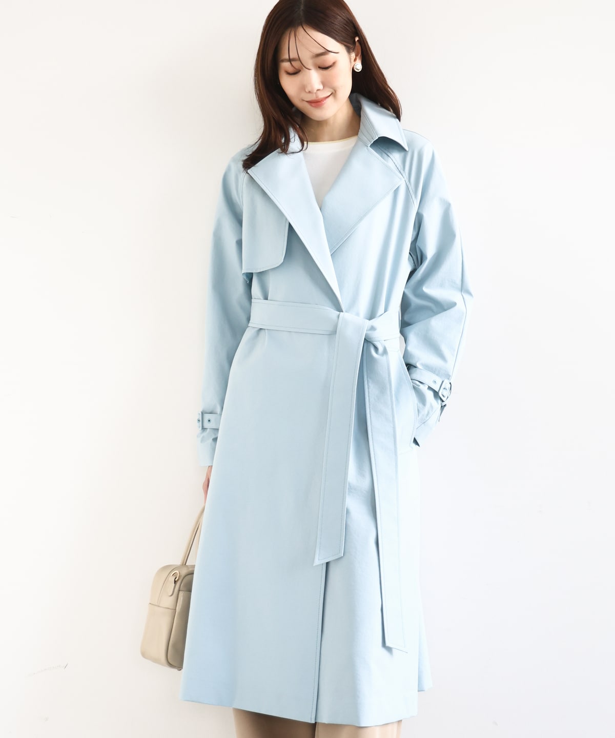 裏地無しの一枚仕立てでトレンチディティールを取り入れたロングコート。ウエストと袖口のベルトデザインでメリハリ感をもたせ、袖口のベルトは袖のボリューム調整も可能。軽くて羽織りやすいデザインが特徴のアウターです。