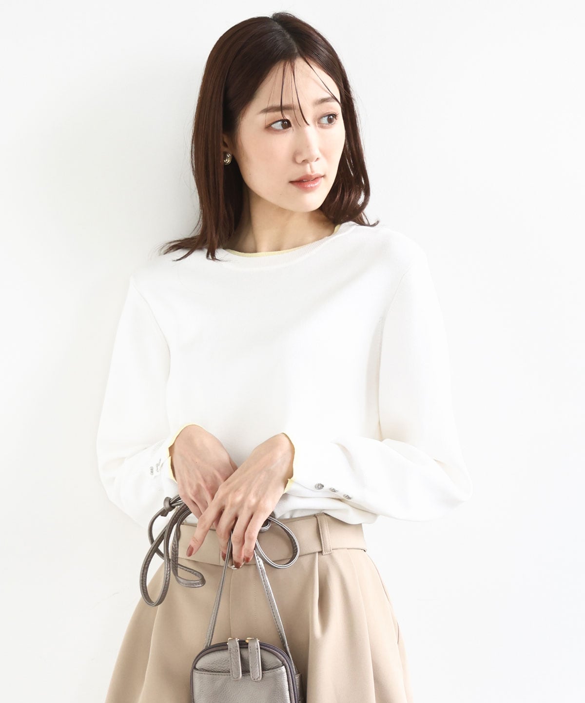 衿と袖口にあしらった配色がポイントのニットプルオーバー。
