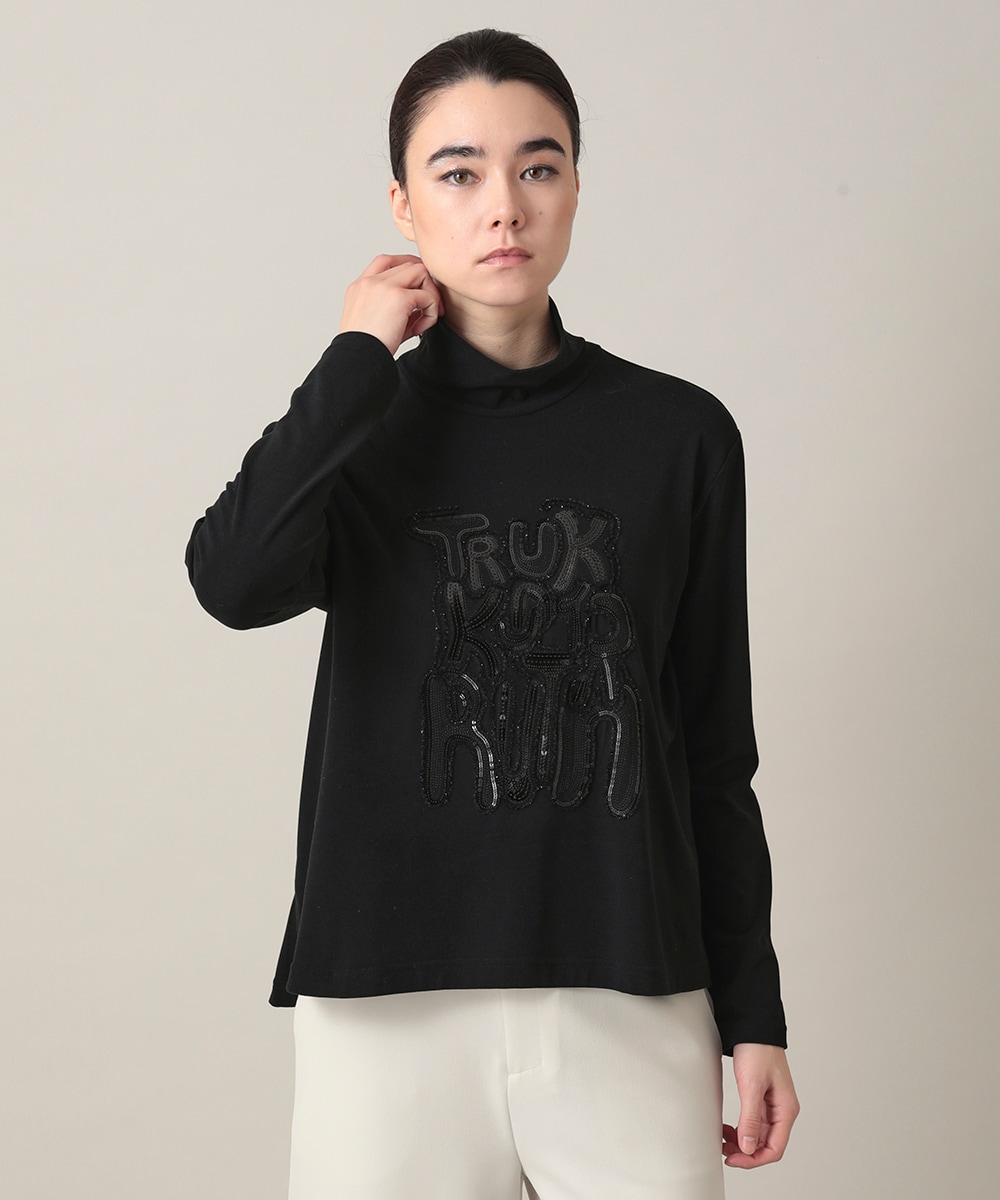 ロゴ柄の上にラメの入ったモールのコード刺繍と、スパンコールを組み合わせた華やかさのあるカットソー。起毛感の暖かみのある素材を使用していて、柔らかい肌触りでとても気持ち良く着ていただける一枚です。衿もハイネックなので、気になる首もしっかりカバーしてくれます。寒い季節に重宝する華やかさのあるカットソーです。スパンコールが付いていますが、家で洗濯していただけるイージーケア商品ですよ。