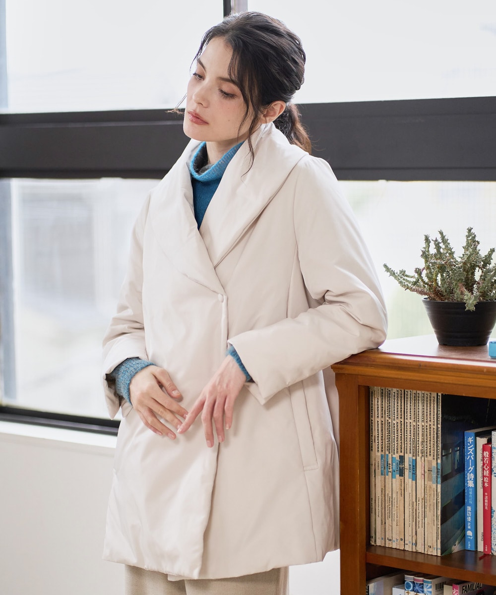 大きめのショールカラーとAラインシルエットが優雅さを演出し、腰丈ながらもしっかりとした暖かさを確保。