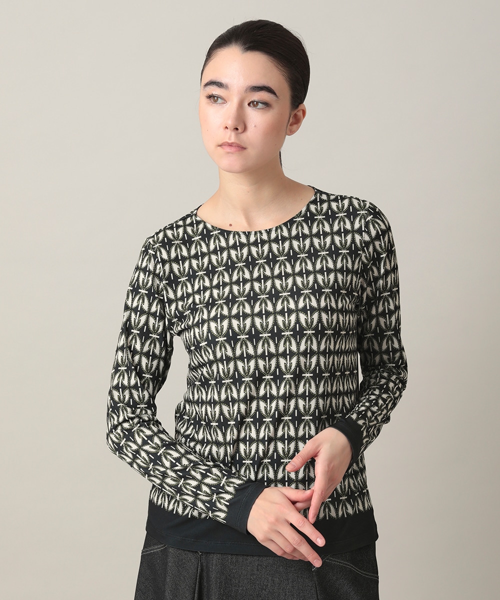 幾何プリントのベア天竺カットソーやクロップドワイドパンツと組み合わせれば、洗練された大人のカジュアルスタイルが完成。