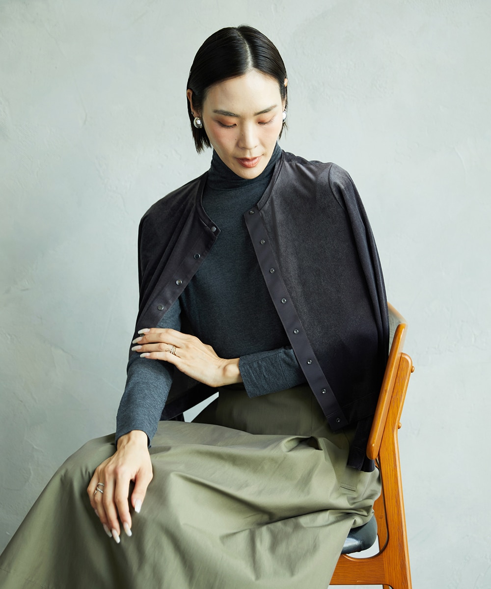 トレンド感のあるシアーベロアのカーディガンを合わせて、程よく華やぎをプラス。