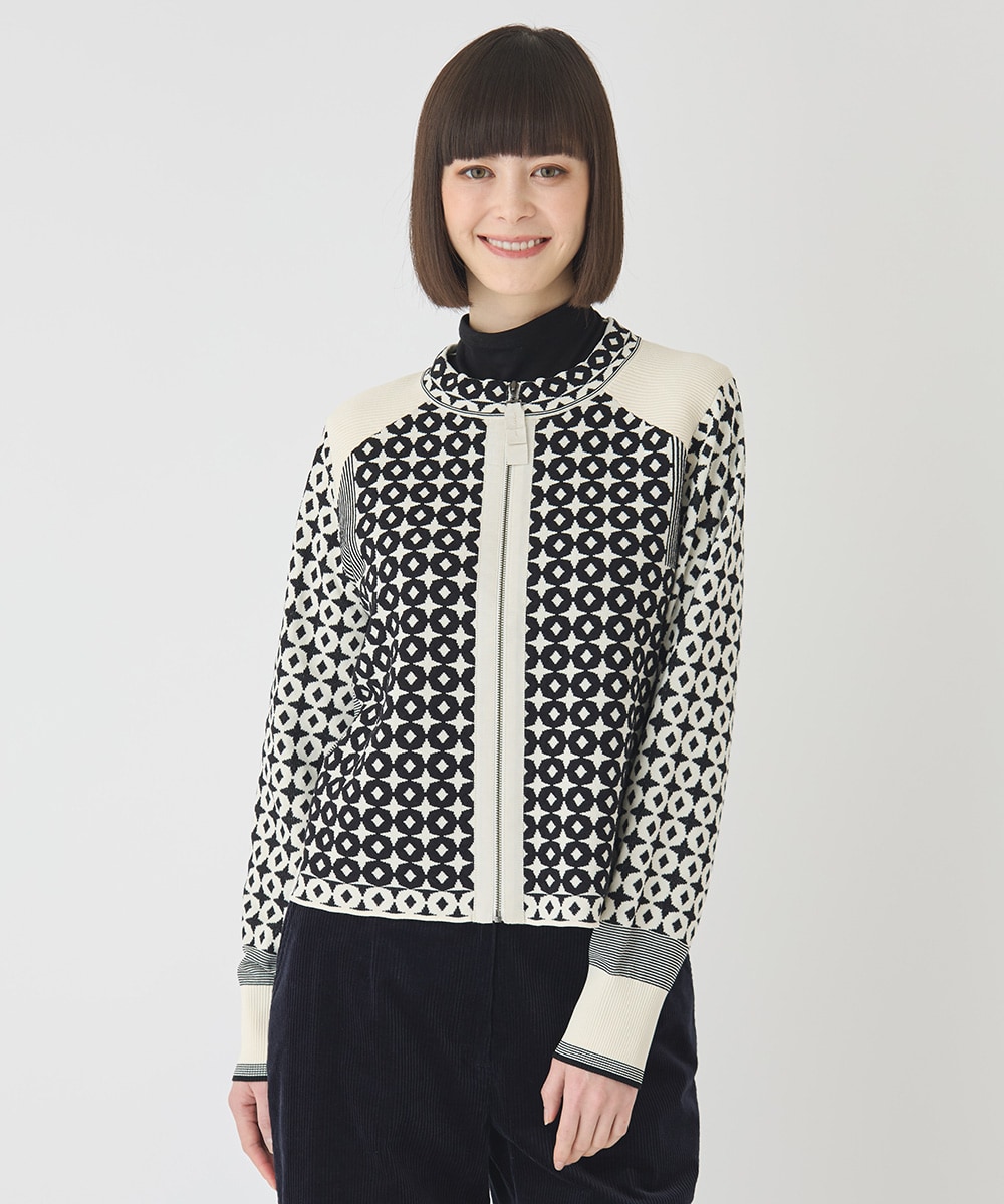 【小さいサイズ】ジャカード×インターシャ幾何柄ニットカーディガン