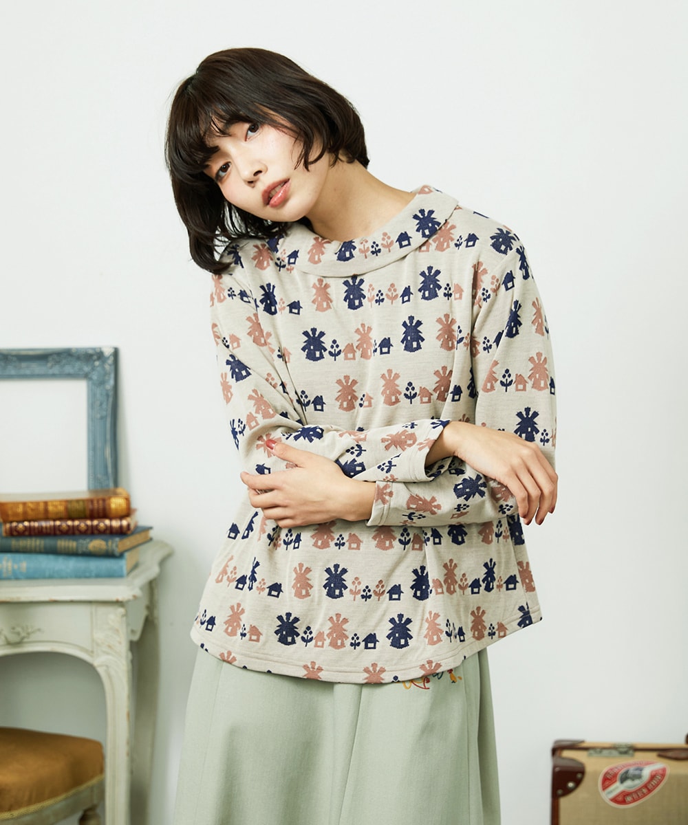 風車がモチーフのカットソー。身幅にゆとりを持たせた着心地の良いシルエットです。一枚でコーディネートの主役になってくれるプルオーバーデザイン。襟元は後ろ開きのロールカラー仕様で、女性らしさを後押しします。ドロップショルダーでリラクシーな着用感もポイント。カットソーながらもブラウスライクに着用できるひと品です。素材は、ポリエステル・レーヨンを使用したソフトなダブルジャカード素材。ほどよい厚みで、物語にも登場する風車をホコモモラらしい配色で表現したカットソー生地です。