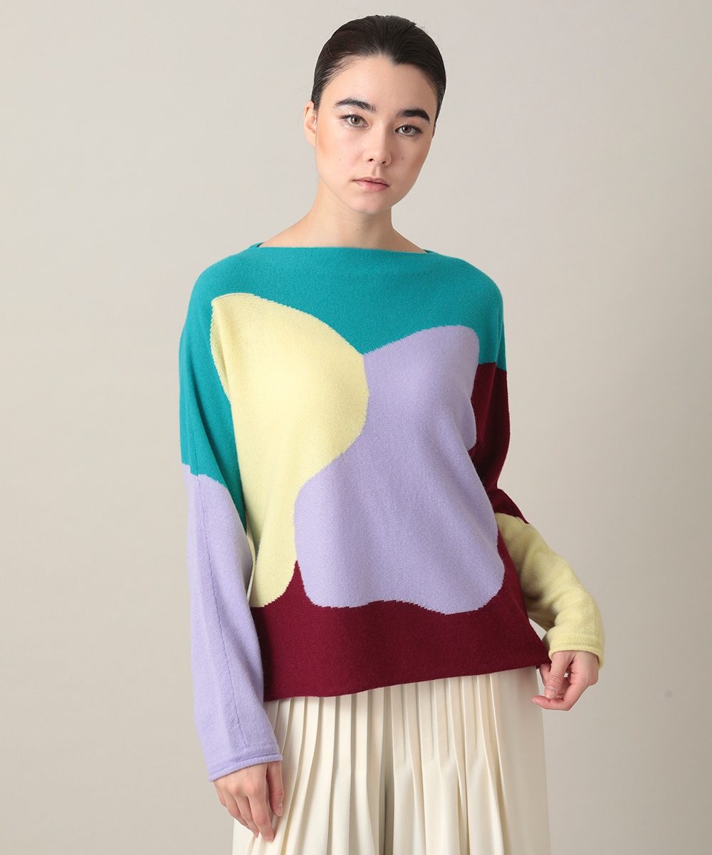 インパクトのあるブロックアートが魅力、曲線とカラーバランスがスタイリングを華やかに彩ってくれる一枚です。柔らかな風合でドルマンフォルムが優しい雰囲気を演出して着心地の良いデイリーにお使い頂けます。
