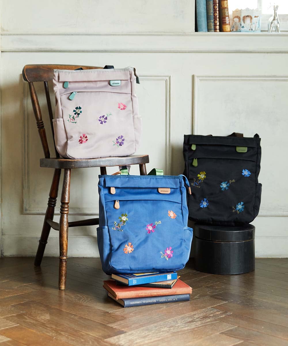 毎回大人気のトートリュックにフラワー刺繍入りに。A4サイズがすっぽりと収まるサイズ感で、トートバッグとしてもお使いいただける便利な2WAY仕様です。両サイドのポケットには傘やボトルなどが収納でき、脇のファスナーから中の荷物を取り出せるのも嬉しいポイント。ストラップや持ち手の配色テープ、裏地のフラワー柄のテキスタイルなども加えてホコモモラらしさがぎゅっと詰まったおすすめのひと品です。