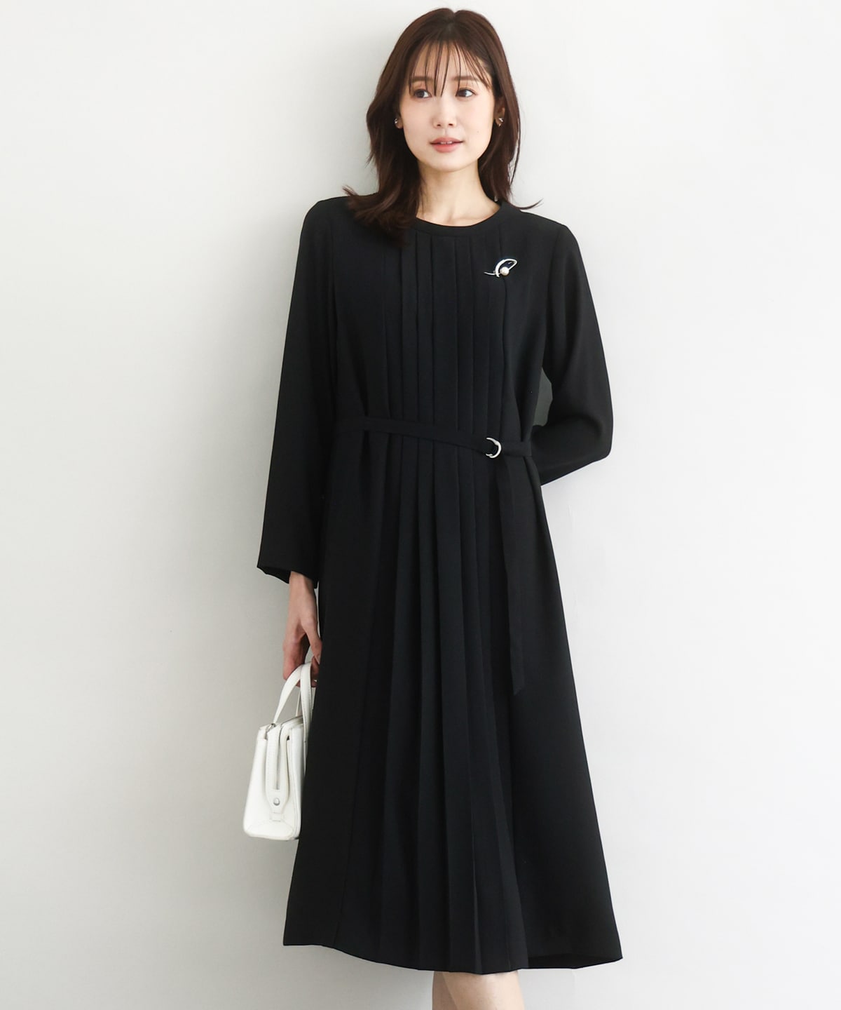 フロントのみプリーツになったワンピースで、すっきりとした印象になります。