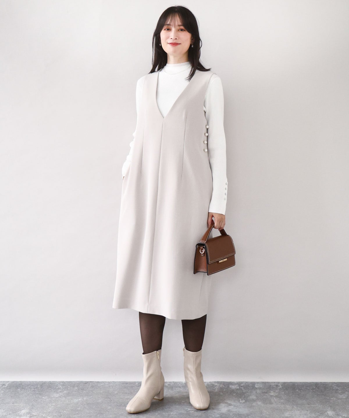 サイドパール調釦デザインVネックジャンパースカートは、脇の大きめパール調釦が華やかさをプラスし、きれいめコーデにもぴったりです。
