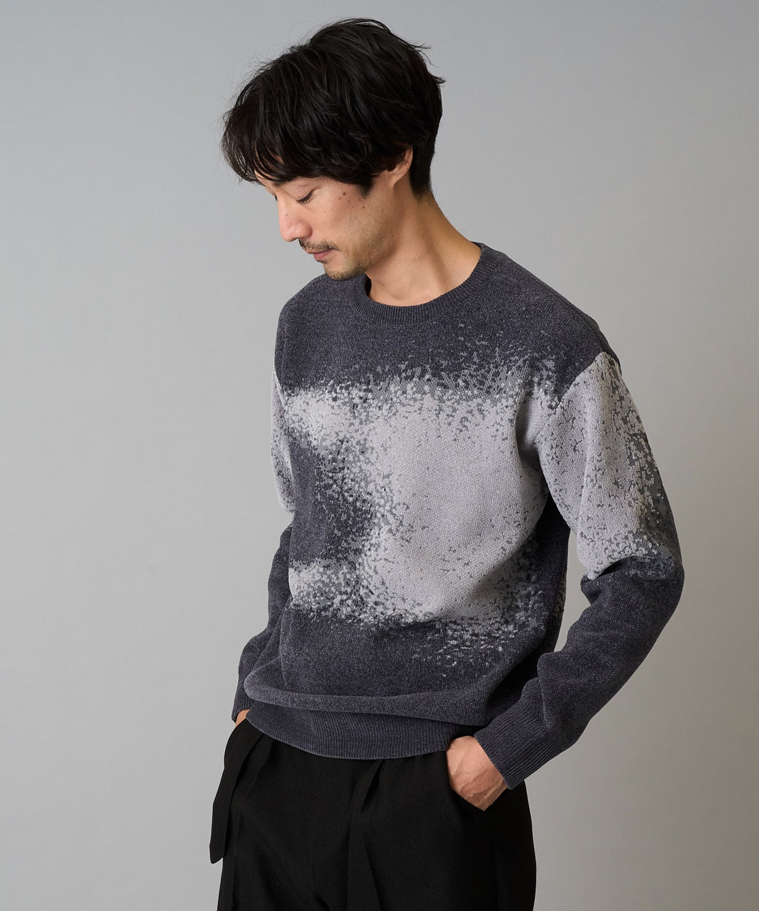 インパクトのあるぼかし柄を大胆にニットで表現した、ジャカードクルーネックニットです!