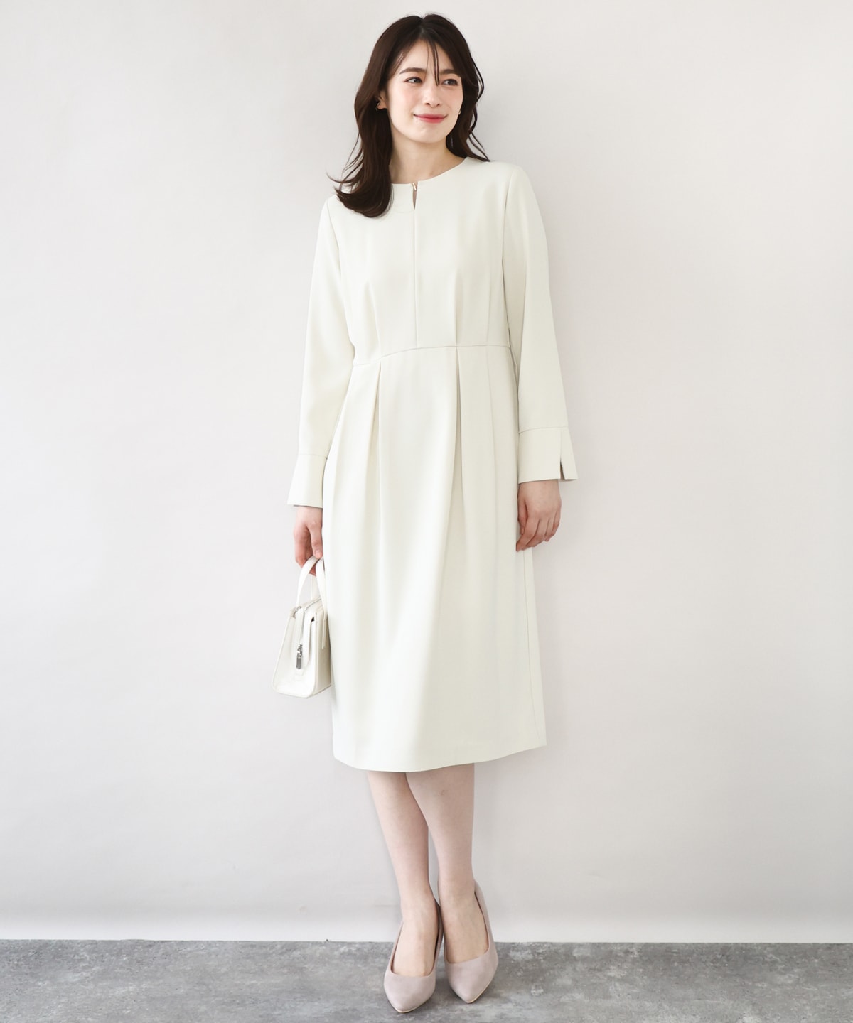 上品なデザインと洗練されたシルエットが魅力のウエストタックワンピースは、セレモニーや入学式、結婚式などのフォーマルな場に最適です。