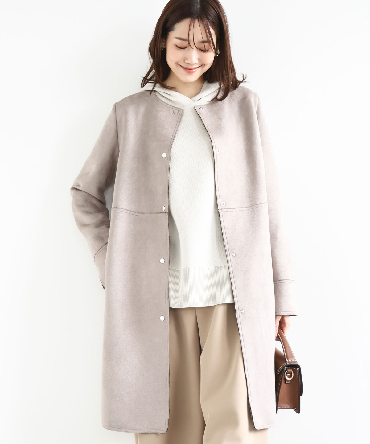 ストレッチの効いた動きやすい軽いコートはスウェード調で高見えするけれどリーズナブル