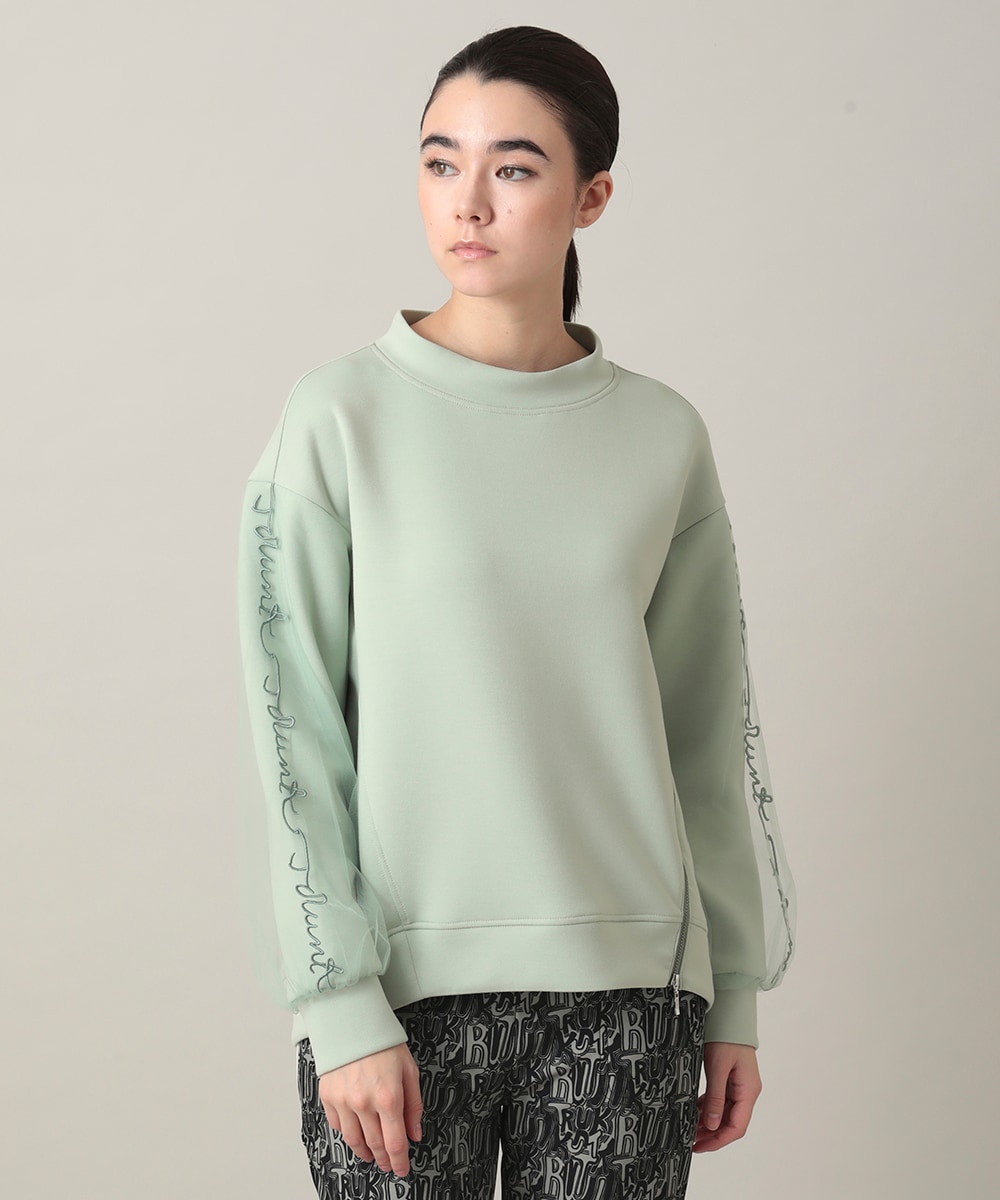 ふんわりと柔らかいダンボールニット素材のチュール刺繍スリーブプルオーバーは、着心地抜群ながら袖のチュールネットがポイントに。