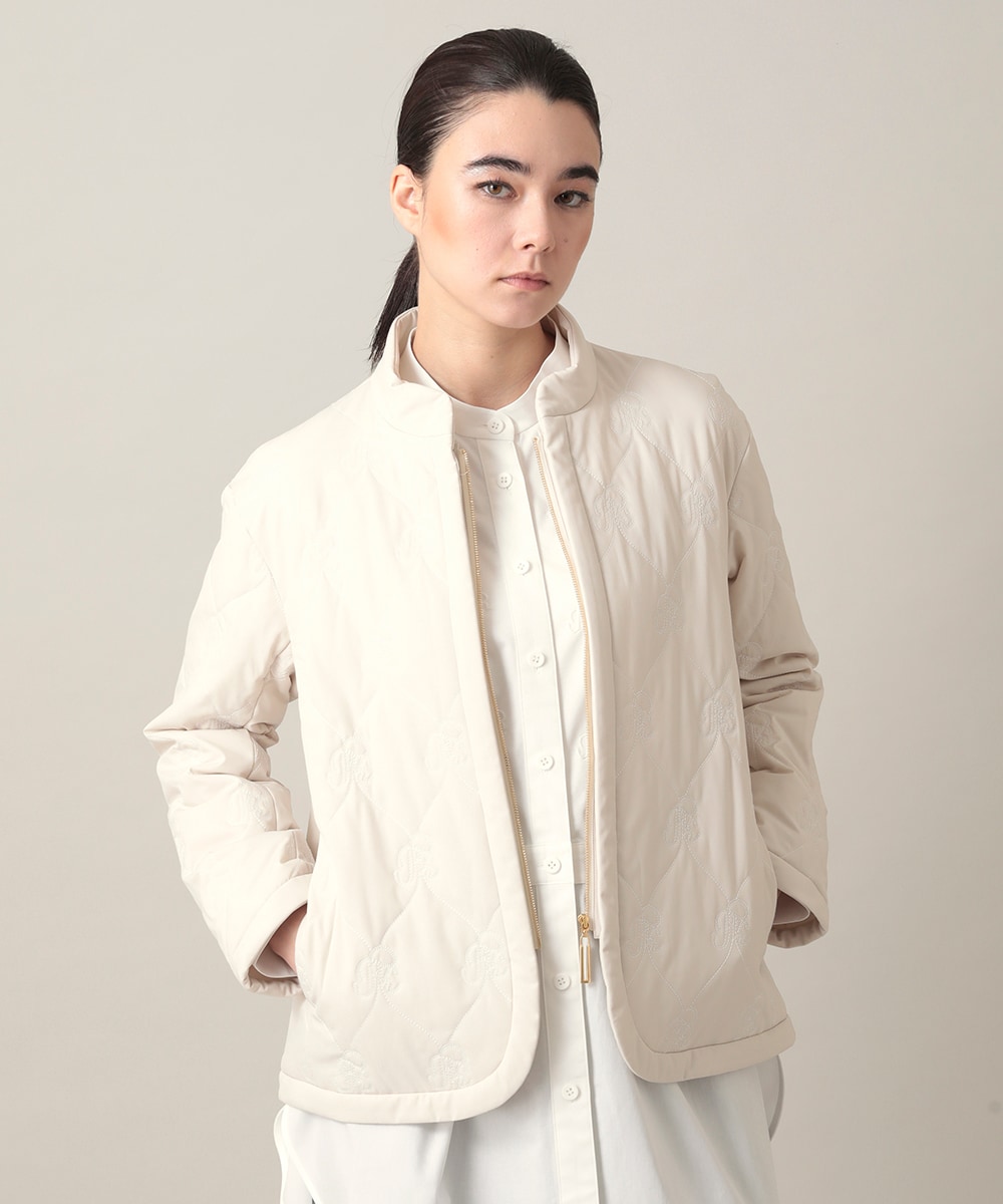 温かみのあるエクリュカラーとオリジナルのロゴ入りキルティングが華やかな羽織りです。鮮やかなパープルのプルオーバーとのコントラストが目を引きます。ミドル丈が全体のバランスをすっきりと見せています。