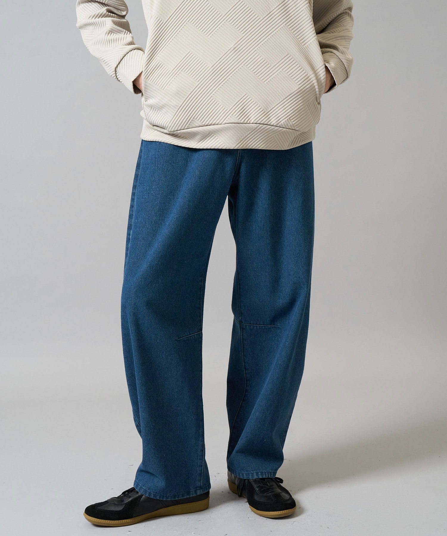 デニムバレルレッグイージーパンツは、13OZデニムの風合いとボリューム感が特徴。