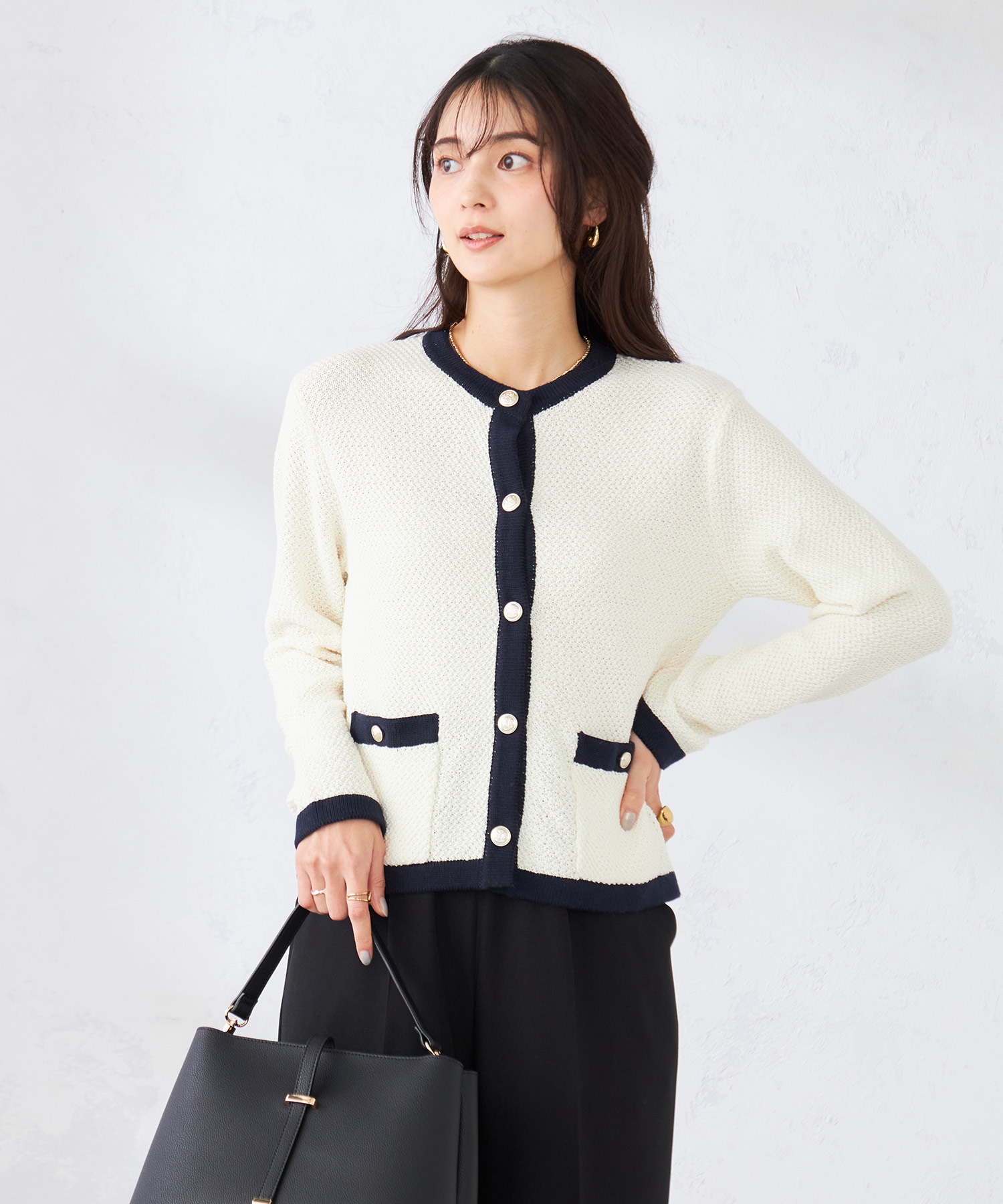 クラシカルな表面感とボタンが上品なカーディガンはFサイズ着用で程よいゆとりが良い感じです