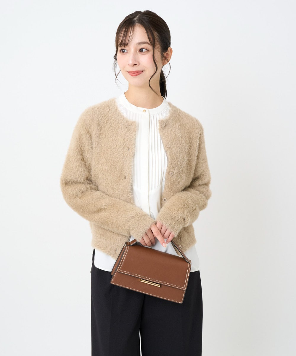 ふわふわシャギー素材のニットカーデを合わせて、柔らかさと上品さをプラス。