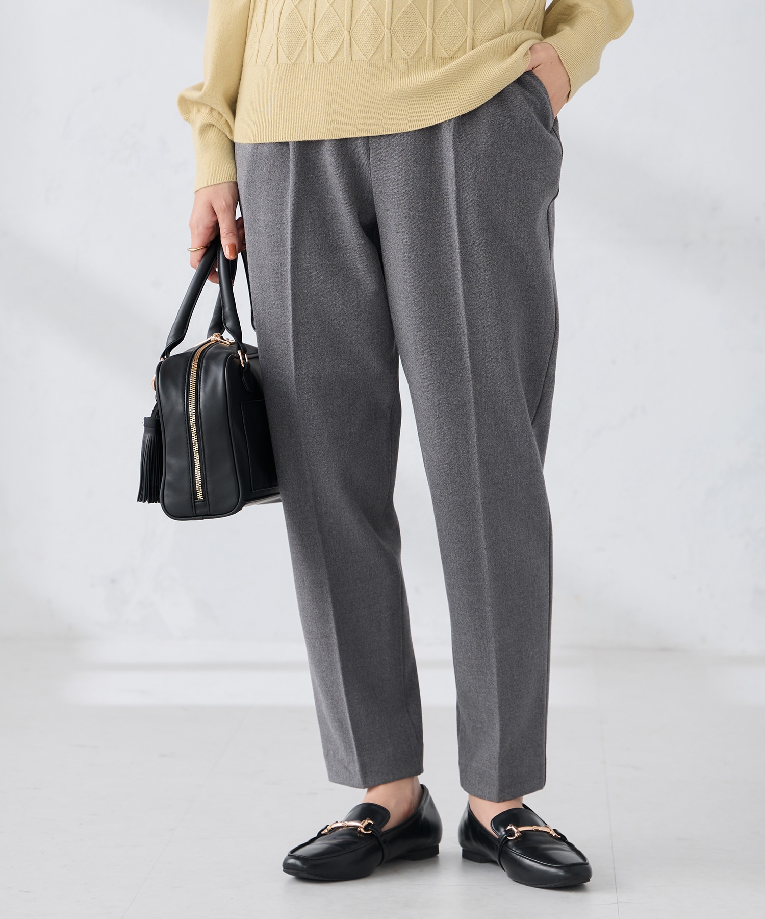 パンツは、ウエストゴムと紐付きで調節可能です。裏起毛素材でしわになりにくく、履き心地抜群です。ワイドすぎないシルエットで、お仕事から普段まで使いやすく着回しも効きます。