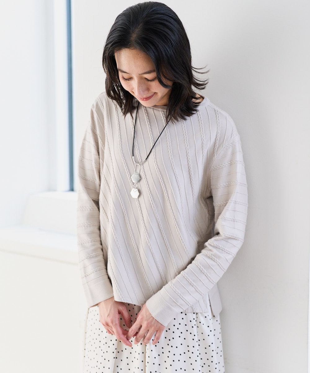 トップスは斜めのケーブル風のタック編み柄がポイントのすっきりとした丈感のニットプルオーバー。ゆったりしたサイズ感でインナーをプラスしても着心地◎ 今から春も着用できるおすすめアイテムです。