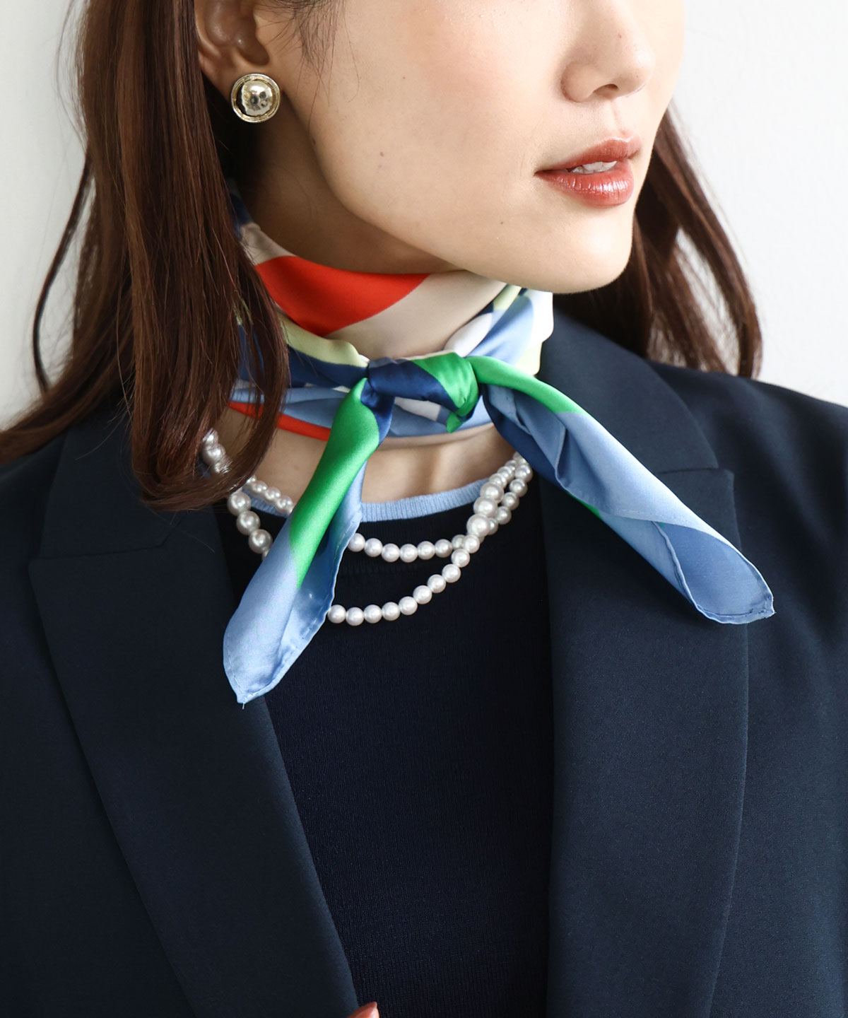 コーディネートにスカーフを加えるだけで春らしく華やかになりおすすめです。