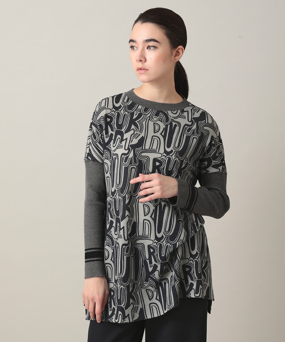 ポリエステル×ポリウレタン混の柔らかく、あたたかみあるストレッチジャージ生地のロゴ総柄が印象的なデザインチュニックです。
