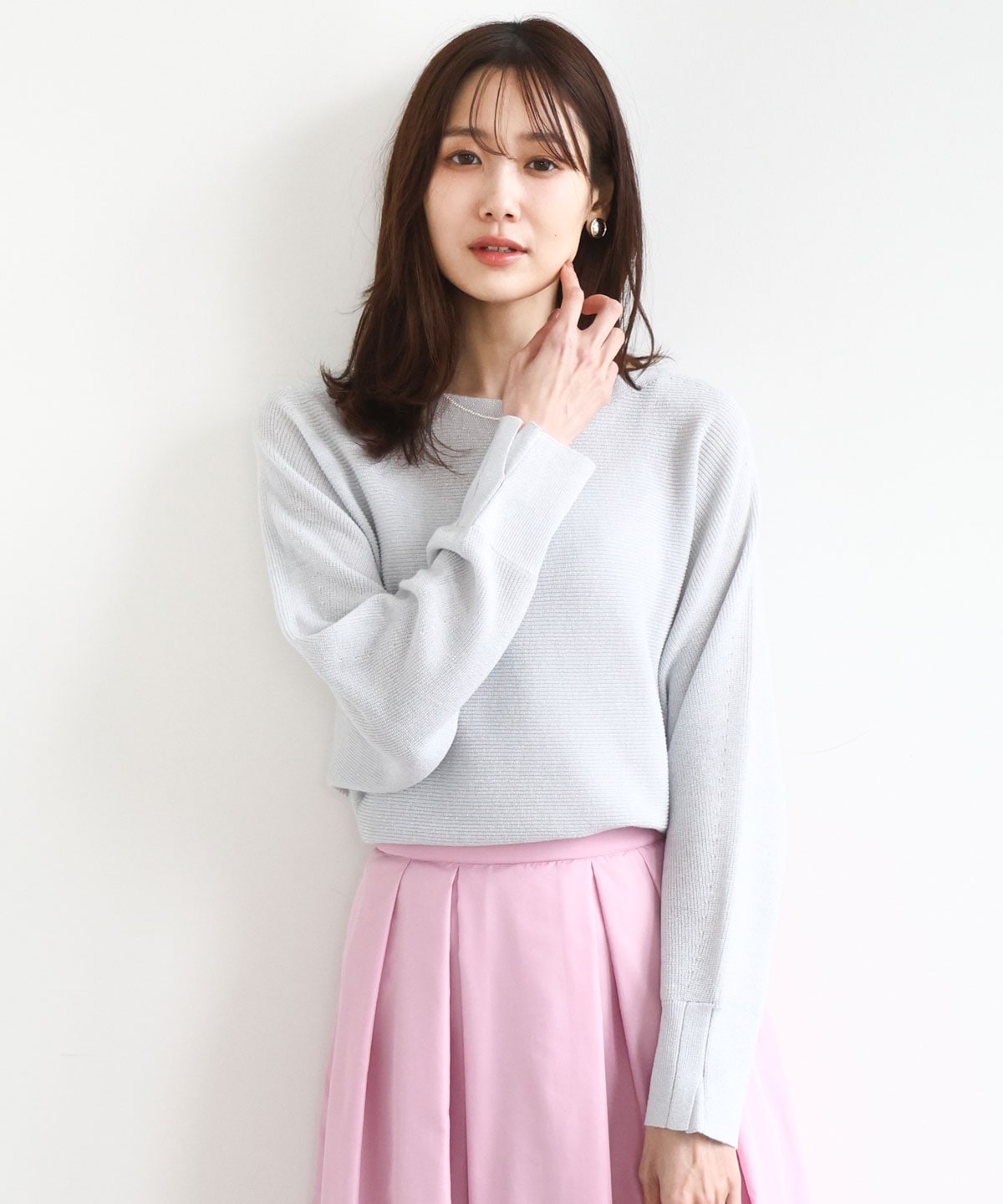 ラメ入りドルマンスリーブ畦編みニットは、上品な輝きが大人かわいさを演出。