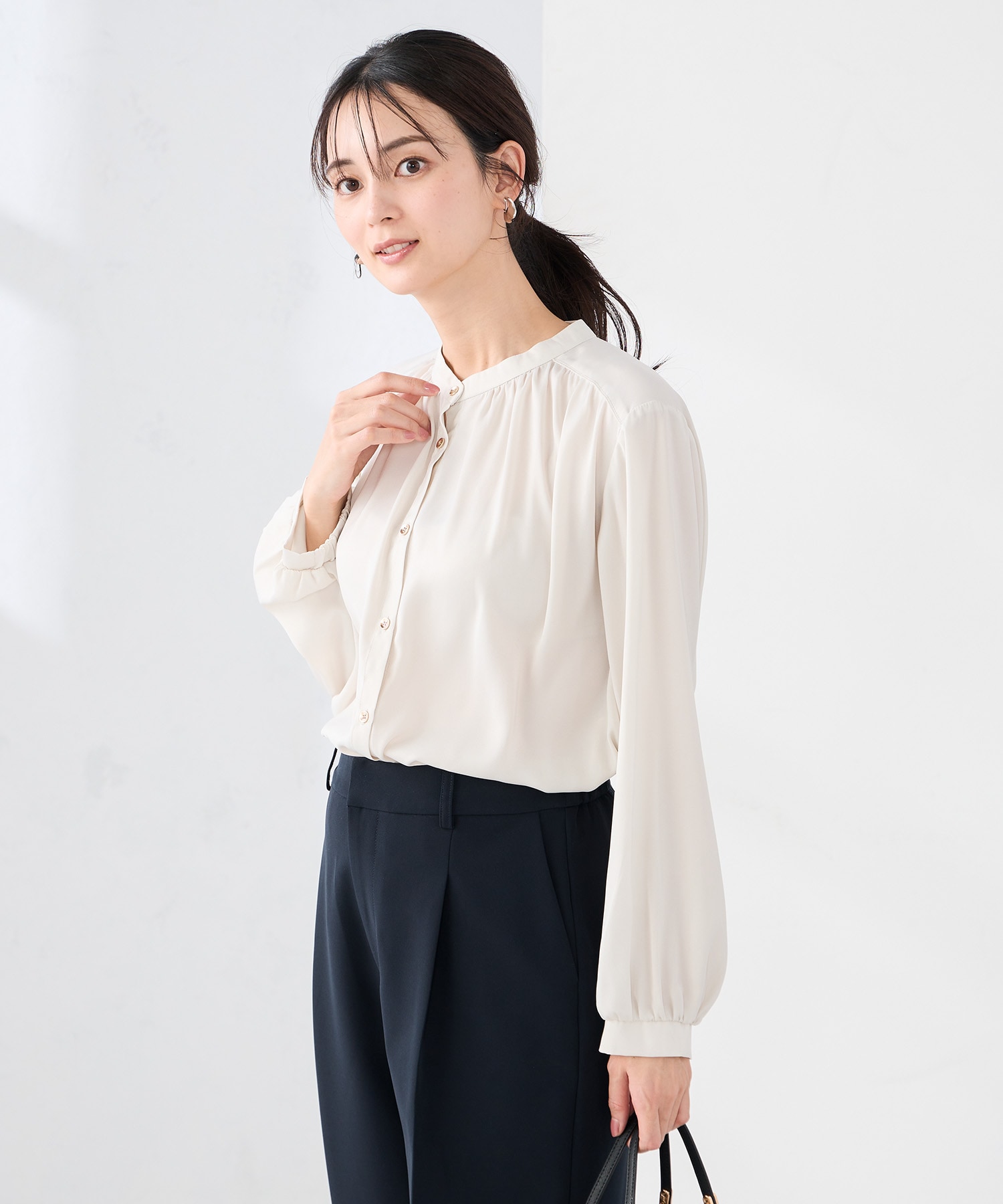 ベーシックデザインに肩回りのギャザーがほどよく華やかな印象