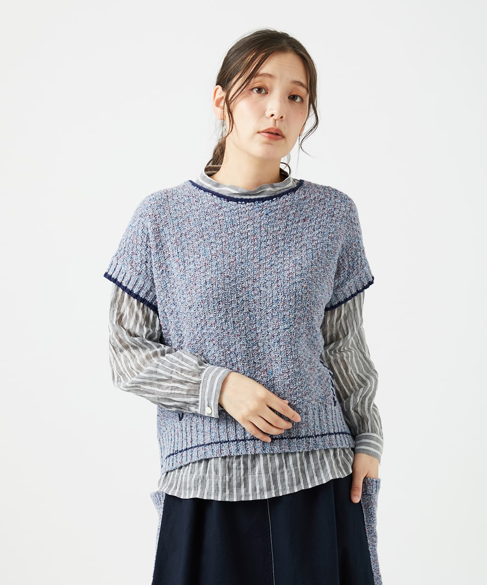 ニットベストは軽やかで表情豊かな素材感が魅力。丸首と凹凸感のある糸が、シンプルながらも洗練された印象を演出します。