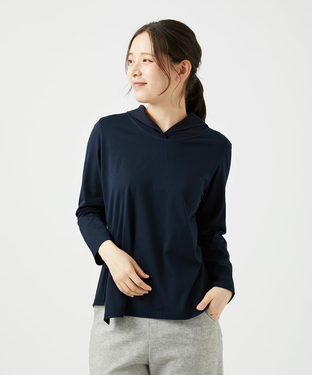 フーディカットソーはキレイめコットン素材を用い、イレギュラーヘムとシアー感のあるフードがアクセントに。着心地も抜群‼︎