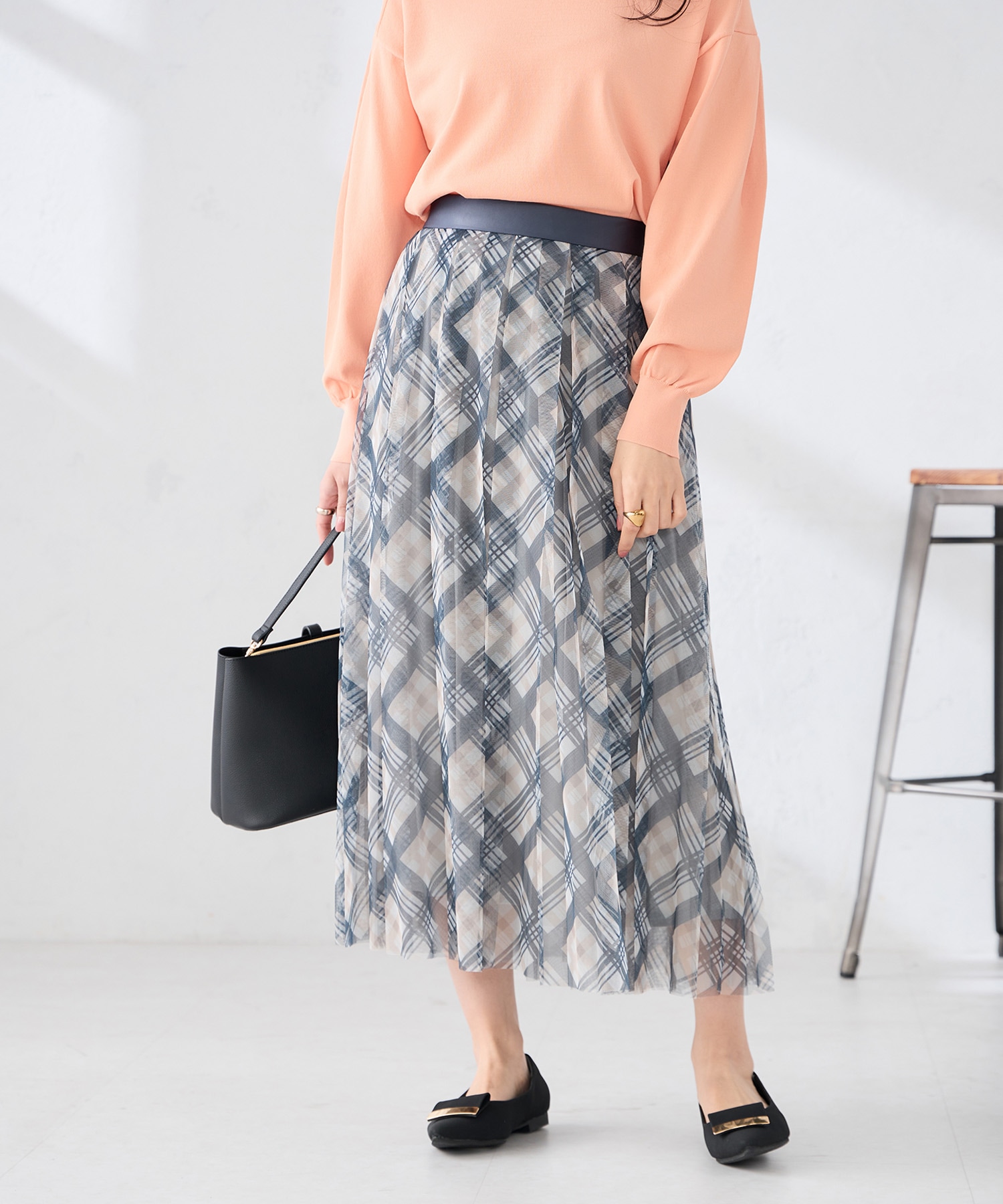 コーディネートしたフレアシルエットのチュールスカートは、重ねたチェックと無地のレイヤードで華やかさと軽やかさを兼ね備え、