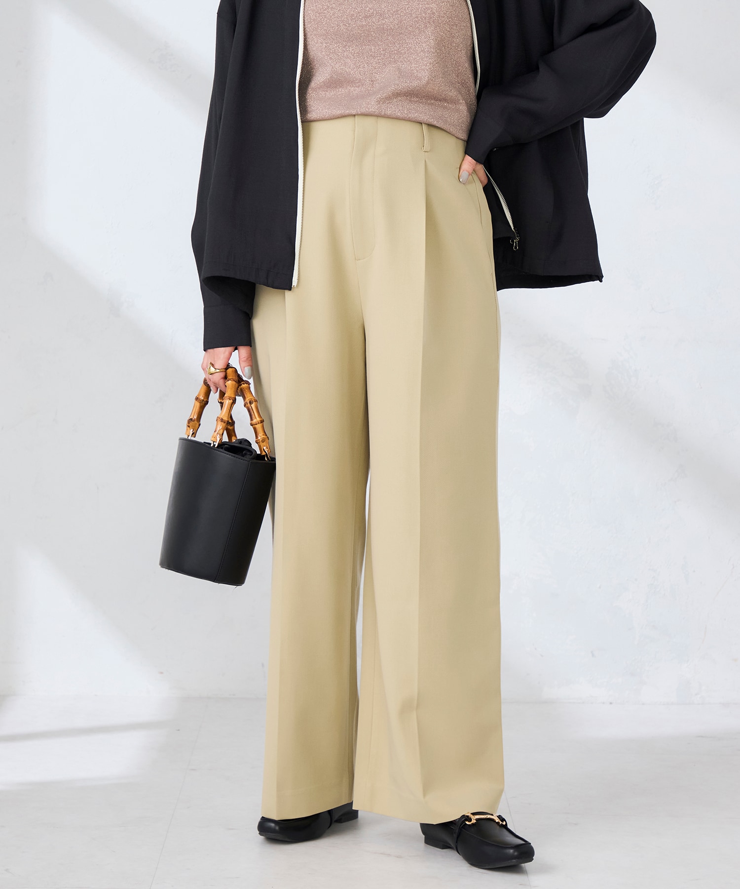 インナーは黒のブラウスで引き締めた印象に。