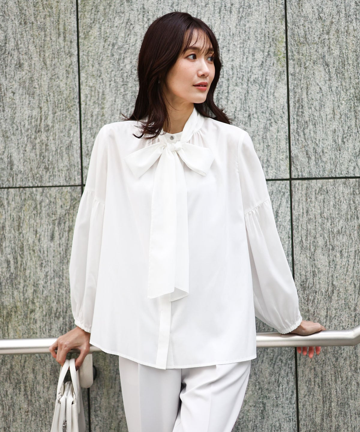 フワリと軽いブラウスは大きめのリボンとお袖に切り替えありのボリューム袖が可愛い一枚